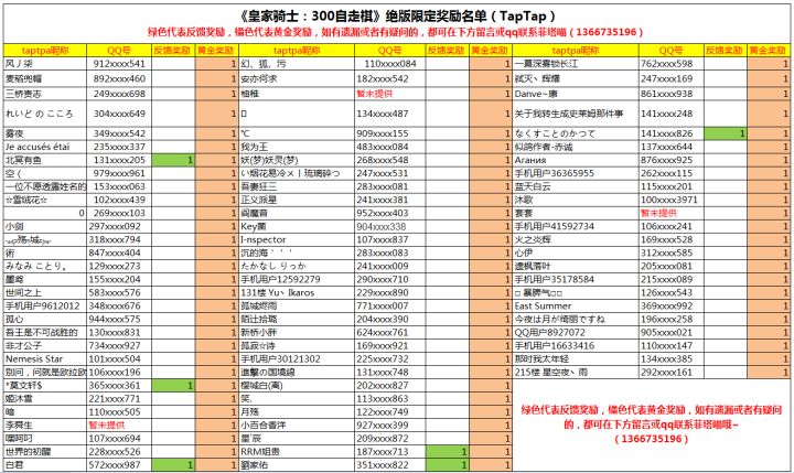 亲爱的小伙伴们:感谢大家的热情参与,“策划面对面第一期: 游戏走向你做主,吐槽提案赢周边”已经结束啦ヾ(๑╹◡╹)ノ"活动链接:以下是赢得定制抱枕or鼠标垫的幸运玩家名单:恭喜以上玩家获得活动奖品,请于2019年7月3日18:00前加入官方QQ群联系管理员员“菲塔喵:1366735196”,并告知TapTap昵称和ID(现在还有4位小伙伴没有联系哦(ノ´▽`)ノ♪)【皇家骑士-300自走
