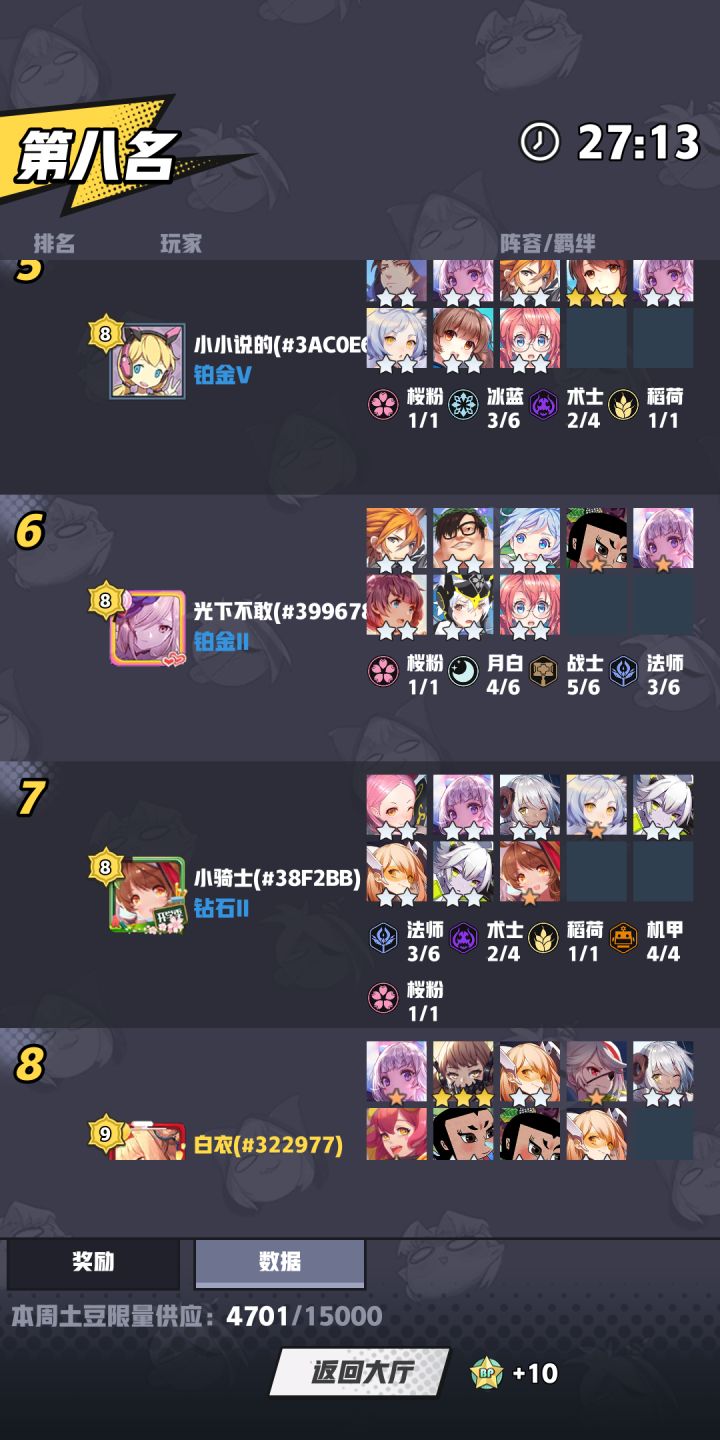 我玩着的时候,中间游戏崩溃掉了(红米K20都带不起来你这游戏吗?),然后我从新连接。打完之后第一名,结算也是第一因为我就这一把升级一个三星孙小美!第一个三星五费棋子。但是我回头看战绩发现我战绩是停留在游戏崩溃之前的战绩两个第七名,最上面就显示个银牌亚军,我冠军就这么没了,真是的,服务器也太差了吧!