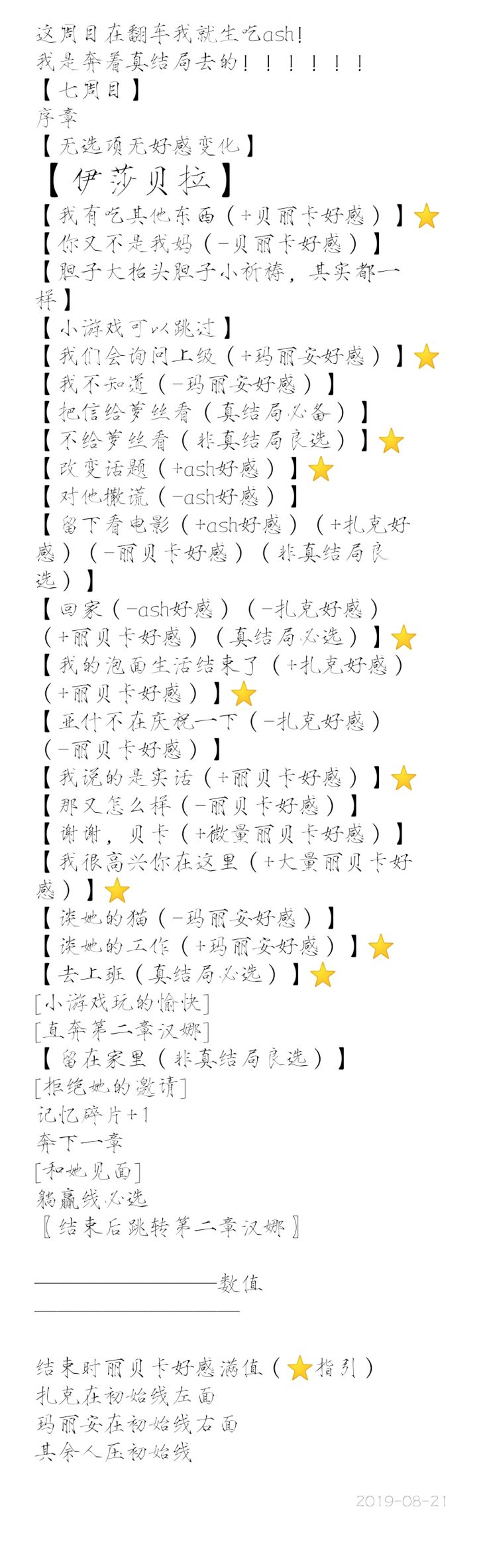 首先呢这份真结局达成攻略只对于打出自己想要的结局后,想探索一下最后真相的玩家们🏁新着手的玩家不建议浏览!!首先既然你看了这个攻略,应该已经把游戏玩的差不多了,我先说一下大概思路①我们的贝拉 贝卡扎哥都要和ash保持很高好感度。(这里不一定要满,但一定要高)②我们的贝卡要和luke保持很高的好感动。③在汉娜篇,我们要让luke把汉娜杀掉。(具体如何杀掉一会会说)。④人员存亡情况是ash死(