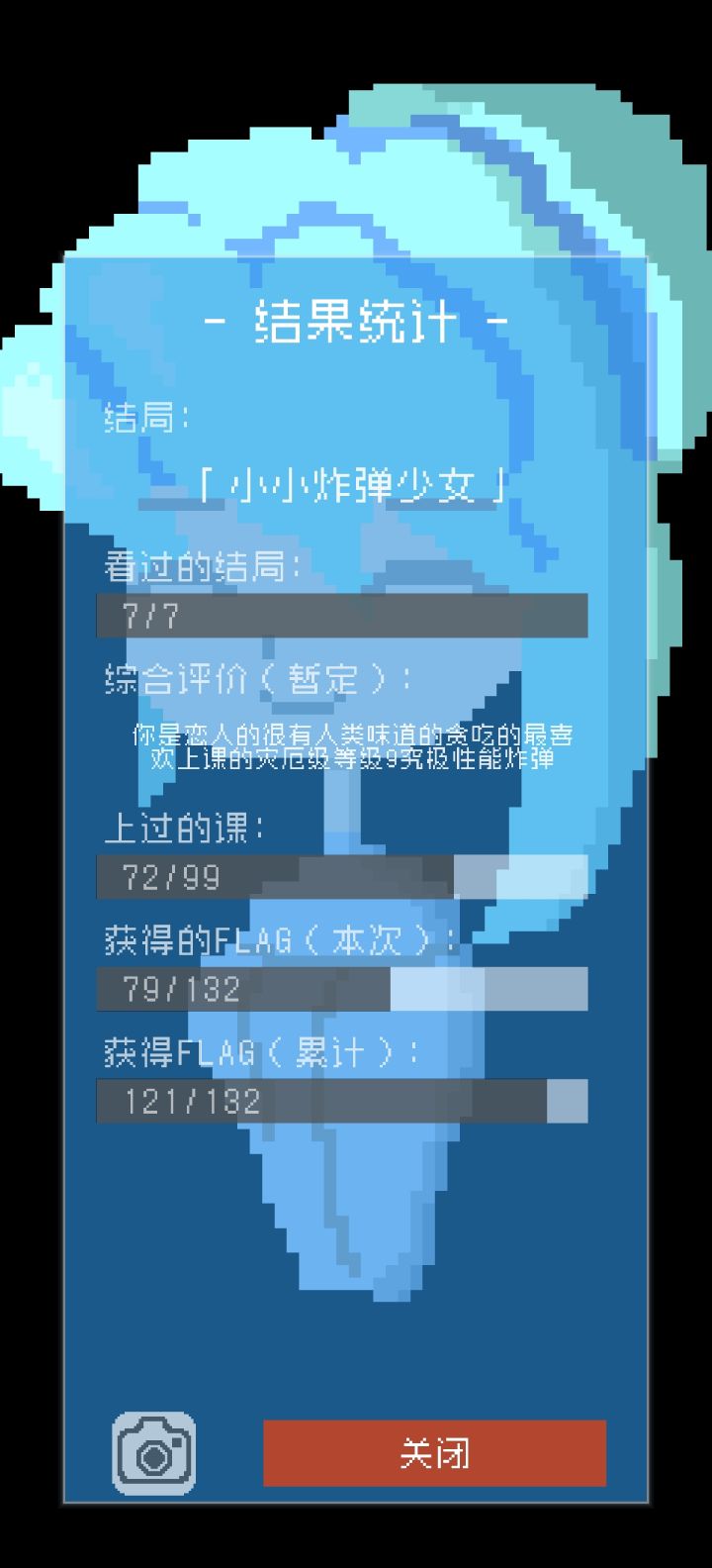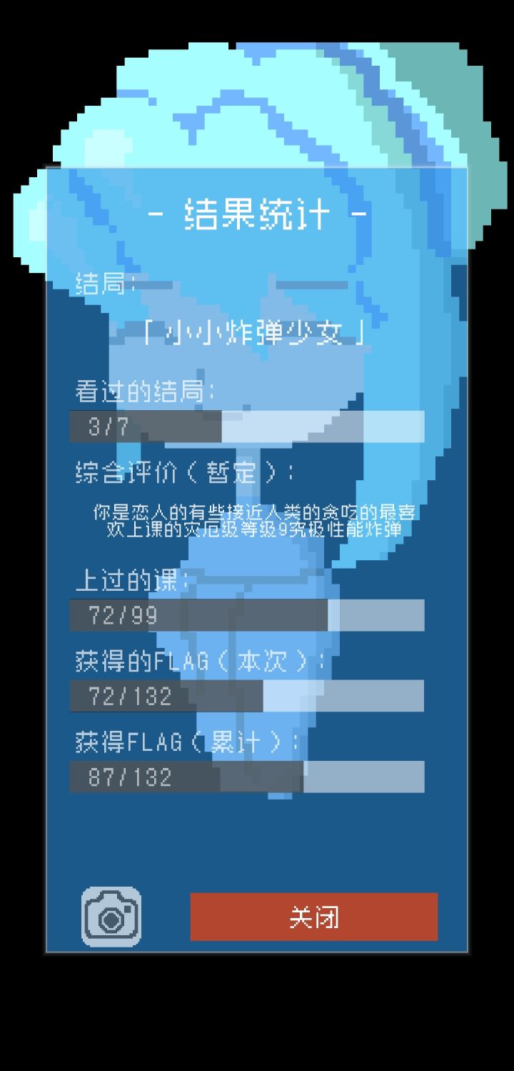 不知道有没有其他人说过这个bug:结局4的时候,选择第一个看视频重来,此时把网断了,就会跳不出广告,然后会回到教学操作界面(炸弹本体和少女都消失的状态)。但是还能进行教学,并且教学的时候少女会蹦出来、换CBU的时候炸弹本体会又出现了。所以,打结局4的朋友们可以卡这个bug,然后继续刷几节课,拿够flag达到结局1、2或结局3呐,可以少重开一次存档了(