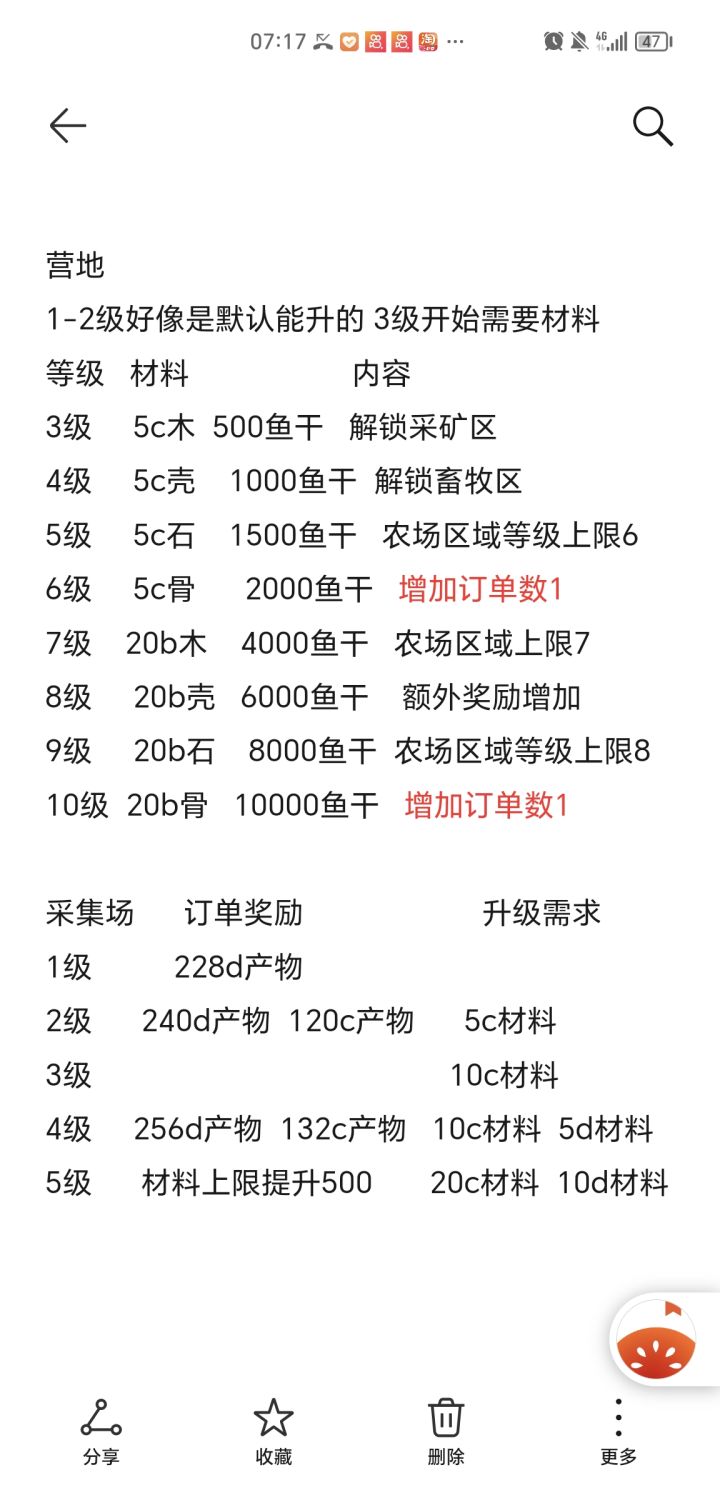 旧版农场攻略已经不适用。前期非常缺少农场升级材料。因此我们要根据奖励和材料消耗做一个优先级。首先要将营地升到四级,解锁最基础的四个采集区。之后,二级采集区增加微量d 产物以及120c产物。所以优先将所有采集区升到二级。四级采集区增加微量d、c产物,这时候升级的意义不大,所以优先将营地升到6级可以增加一订单数。如果b材料多,营地升到10级可以又增加一订单数。每日挑战必出材料,而且出A材料的概率