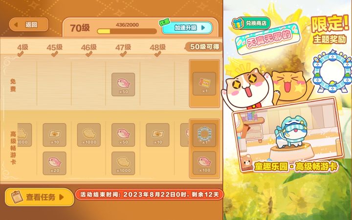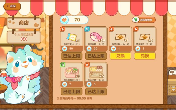 旅行的左上角可以切换每日挑战和主线关卡。每日挑战掉落大量农场升级的素材。农场建议仓库6→8→10(增加单只猫猫的工作时长,10级单只猫猫工作2h)便当后期攒了一大堆没用,不如前期快速养成A级以上的猫猫!(稀有度S R A B C D)剧情给的吹泡泡糖的啵啵和拖孩,孵蛋出的猫猫,签到七天给的吐司属性都非常好!拿到就喂起来!不用省!给我喂!【修正:C级菜肴满级15 B级菜肴满级24 A级菜肴满级3
