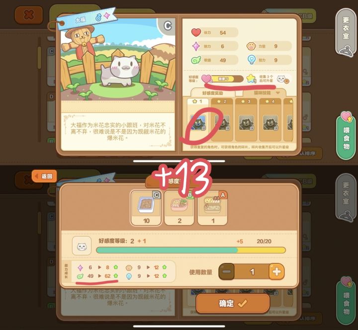 本次对比的是四只同样是c级的 猫咪技能均为敏捷属性的猫猫 。大家都知道 猫咪分别有五种技能属 分别为体力、魅力、力量、敏捷和智力。而在猫咪手册中点击猫咪技能 可以知道猫咪什么属性升级是最快的 。那么问题来了,相同等级的猫咪 他们最高属性好感度提升一级,增加的数值是否相同呢?🐱第一个对象是猫咪大福:好感度:❤️❤️ 星级:⭐提升提升一级好感度,敏捷属性增加13点🐱第二个对象是猫咪芊芊:好