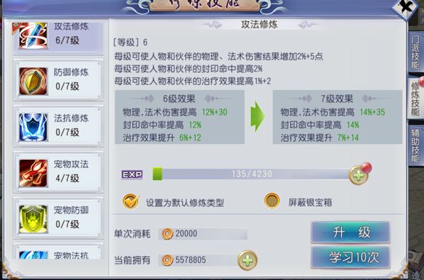 【修炼技能】开放条件:人物等级≥45级修炼种类:(点击可查看修炼效果)攻法修炼 防御修炼 法抗修炼宠物攻法 宠物防御修炼经验获得:1、使用修炼丹可获得300经验2、开启银宝箱最高获得300经验3、通过“海上贸易”玩法获得4、直接使用铜币升级更换修炼种类操作:主界面点击技能→修炼技能→选择需要修炼的技能→勾选【设置为默认修炼类型】修炼顺序推荐:攻法修炼>法抗修炼>防御修炼>