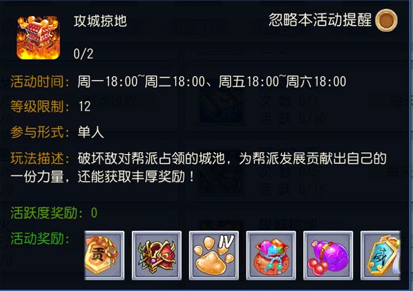 【攻城掠地】活动时间:周一18:00至周二18:00和周五的18:00至周六18:00参与条件:帮派等级≥2级、人物等级≥12级、入帮时间≥1天、单人玩法活动位置:点击“日程→攻城掠地”参与开启条件:服务器等级≥40级活动说明:1、一方全灭则战斗结束,存活的另一方获得胜利2、进攻方20回合内无法全灭防守方,则攻城失败3、防守方有3个星级强度,进攻方攻打2星防守方成功,则为帮派获得2