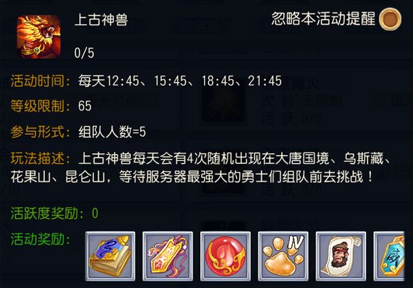 【上古神兽】活动时间:每天12:45、15:45、18:45、21:45参与条件:人物等级≥65级、组队人数=5人刷新位置:随机出现出大唐国境、乌斯藏、花果山、昆仑山活动说明:1、活动开始后,系统将会出现提示,前往相应场景内击杀怪物,获得活动奖励。2、每次会刷出不同星级神兽,挑战难度也将不同,挑战队伍要量力而行哦。33、一天只有前5次挑战会有奖励。小Tips:1、上古神兽难度较大