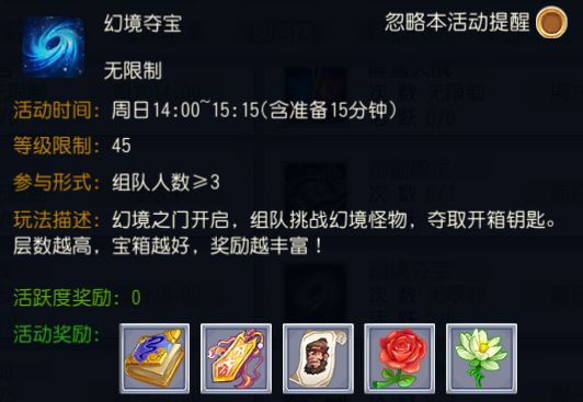 【幻境夺宝】活动时间:每周日14:00-15:15(含准备时间15分钟)参与条件:人物等级≥45级、组队人数≥3人活动位置:点击“日程→限时活动→幻境夺宝”或者通过长安城活动NPC进入幻境层数:20层(每层有一真一假传送人,位置随机出现)活动说明:1、活动开始后,玩家在场景内击杀怪物,获得活动临时道具和宝箱钥匙2.通过传送NPC,进入到达不同层数的幻境,层数越高,怪物越强,奖励越好3
