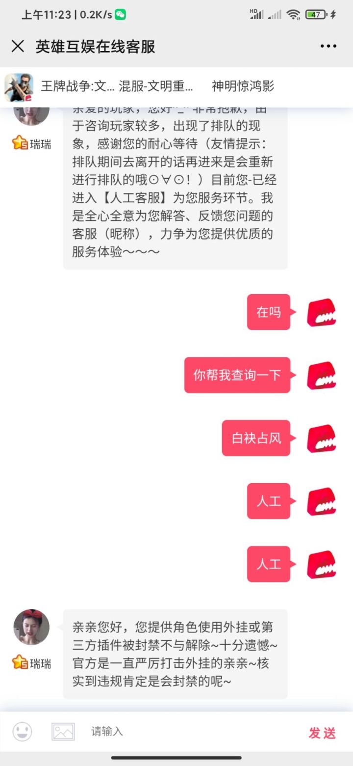 无缘无故封号 充了500多 有一段时间没玩 8月30号夜里无聊想着下回来玩玩 刚进去没5分钟给我封了10年 说我开挂用插件 当时我朋友还让我看看手机后台有没有运行修改器什么的 我当时后台就只有qq 两天了找客服 客服就一直那几句话不给解决 申述没用 有苦不知道找谁