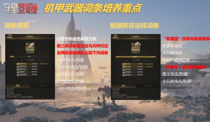 昨天我们聊了聊佛系玩家如何培养自己的机甲武器,今天我们再结合英雄阵容说说机甲武器词条的选择。以橙色和金色武器为例,前三排固定词条会与兵种相关联,而后两排随机词条则推荐能够强化英雄阵容的词条,例如“歌舞团”选择改装车相关,“野雷猛”选择攻击相关!整体来说目前优先选择的词条是全兵种攻击/防御、兵种攻击/防御、全兵种造成伤害,其中全兵种造成伤害会比攻击收益高,其次就是战术攻击/防御,最后就是攻/守城攻击/防御。