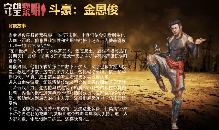 【新英雄爆料】废土世界最强的武术家!废土大陆的生化人日益猖獗,幸存者们的生存环境将遭受前所未有的严峻考验。正当幸存者茫然之际,两位新英雄从远方赶来,化解这次废土大陆的重大危机,他们分别是斗豪:金恩俊与瞬影:玛格丽特。在认真阅读金恩俊的背景故事后,相信各位指挥官一定对他的定位、搭配的英雄以及技能效果都有了自己的看法,欢迎指挥官们踊跃评论并留下你们的ID,我们将会抽取5名幸运指挥官,发放幸运好礼一份!