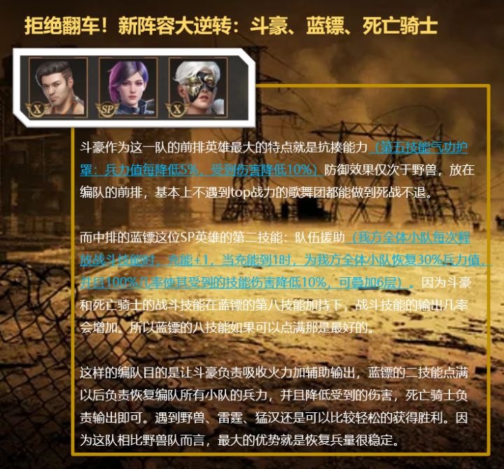本届卡塔尔世界杯上,先有阿根廷爆冷沙特,后有德国憾负日本,可谓是爆冷不断!而在废土大陆上目前伤害最高却也最容易翻车的就是歌舞团阵容了,尤其是遇上野兽队,高属性的歌舞团会被野兽队利用技能的优势进行“反杀”,最终导致了歌舞团翻车事故!那么有没有克制野兽队的阵容呢[思考]答案是肯定的,下面就跟着卡希尔一起看看每周推荐阵容——斗豪,蓝镖,死亡骑士!