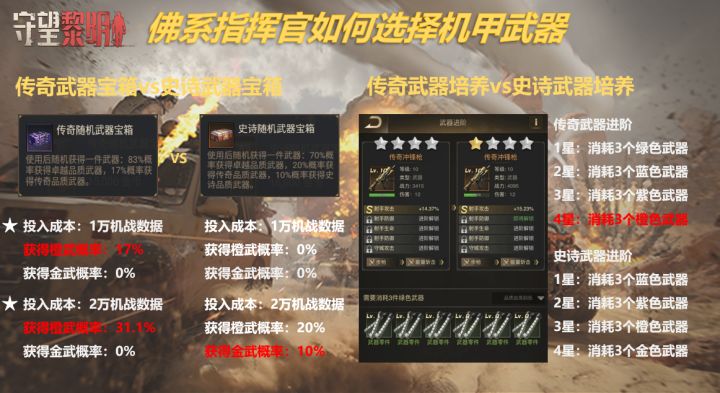 新的机甲武器已经在上周开放获取,相信有不少佛系玩家正在纠结如何培养自己的机甲武器,下面就跟着卡西尔一起来看看吧对于资源有限的佛系玩家来说,橙色武器养成所需的材料相比金色武器大大减少;而在投入成本相同下,开启“传奇武器宝箱”获得橙色武器品质的概率要比开启“史诗武器宝箱”获取还要更高一些!看到这里,相信各位指挥官都已经有了答案,同时也欢迎大家在评论区踊跃留言说一说你的理解!