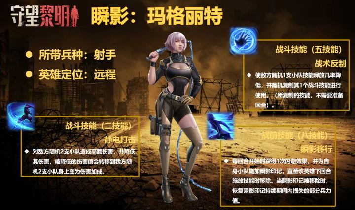 【新英雄爆料】瞬影:玛格丽特技能一览!玛格丽特手持的长鞭能释放出高压电流,瞬间击垮敌人,其战斗服配备了蓝宝石型微波激射器,作战时能够远距离捣毁一切电子设备。根据玛格丽特的定位以及技能,我们推荐尝试深潜者+瞬影+坚炮阵容搭配!欢迎各位指挥官在评论中留下你们的想法!