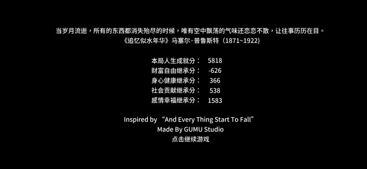 玩了四五遍,各种路大概走了一遍,我感觉这个游戏很好了,只是靠走路就让我感觉到作者的一些新意。(也可能是我脑补太多,过度解读了)在最开始你还是个孩子,会经历一样的事,遇到的无非就是自己的亲人,他们对你做的就是不断的鼓励(在前面的剧情好像没什么减数值的)。到了小学和中学,自己开始有了分叉的路,但还是要靠自己走的,向上跳跃来表现自己的努力(这会避免大多数减少数值得事件),相反,直走就会遇到大多数学生遇