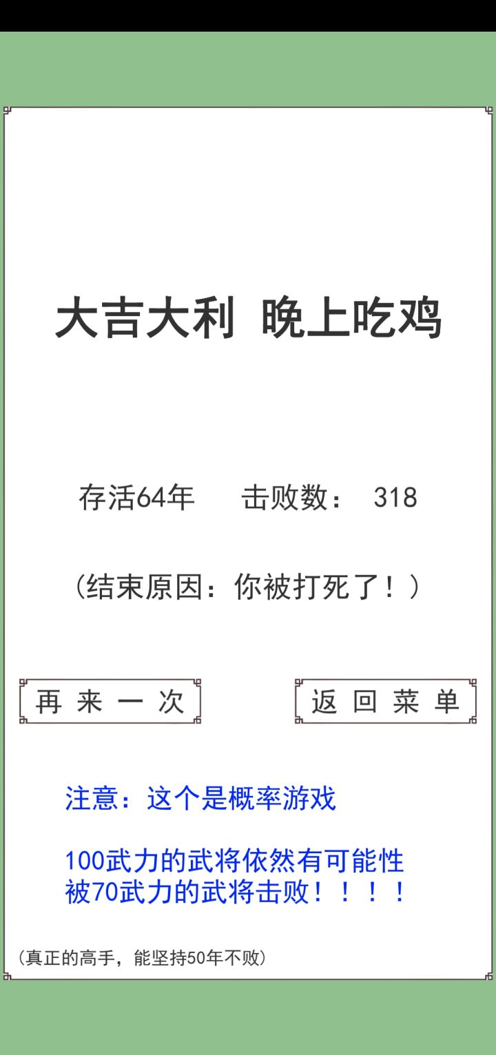 玩了一下,游戏很好玩,但是对我这种人来说,耐玩性不高。以下纯建议:增加成就系统,这玩意说白了就是收集元素。比如说拥有刘关张可以触发成就【桃园结义】比如说拥用刘关张并对战吕布,可以触发成就【三英战吕布】其他的都挺不错了