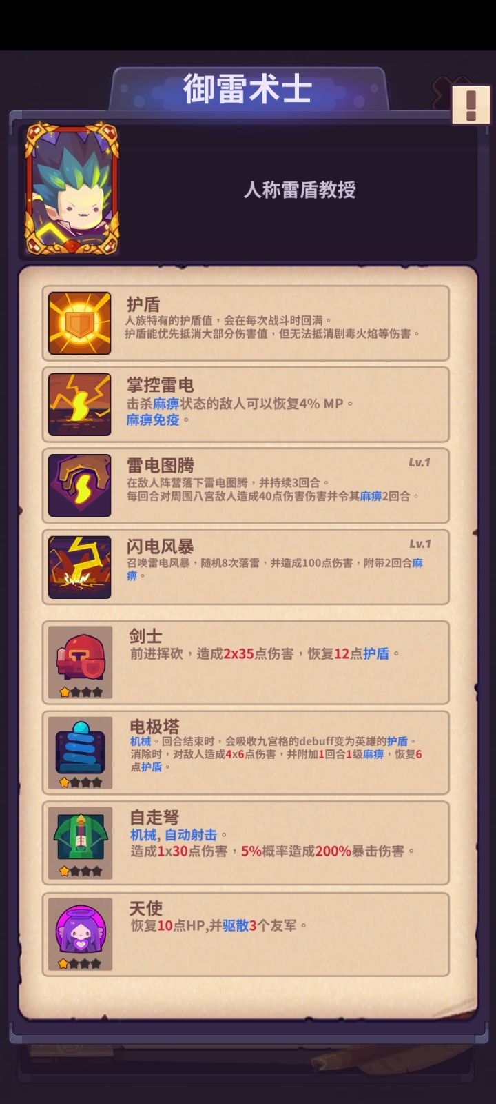 -------简介-------御雷术士是人族最后一个英雄,在人物上面,基本趋于完美,在人族特有的技能加成下,可以称之为(人族最强)--------人族被动:护盾-------人族特有的护盾值,会在每次战斗时加满互动可以有优先抵消大部分伤害,但是无法抵消火毒等伤害(毒和火焰会无视护盾直接攻击血条)--------技能介绍---------特殊被动:掌控雷电其杀麻痹状态敌人可回复4%m