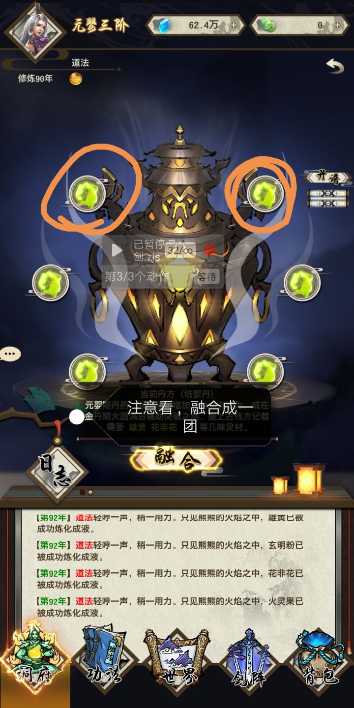 现在炼丹手法有三种1,数次数,技术量太低,听说有点效果2,看那个药团,最哒或者最小的时候点击融合(我习惯最小,下次测试最大)3,融合的三项指标,金丝容易飘香,灰色区域容易焦香,金色区域容易飘香第二三点可以看成一个独立的小游戏意思就是一条进度线只有极小的部分是增加火候的,就像渡劫吃药会增加成功率,但是不会100%成功有用请点赞关注不迷路😉️