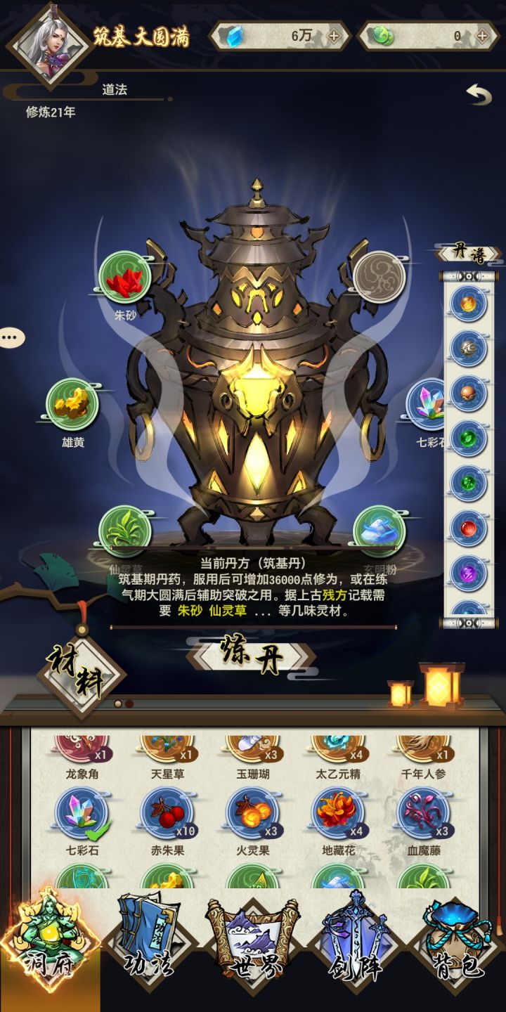 仙家炼丹术—筑基丹丹方:朱砂 仙灵草 雄黄 玄明粉 七彩石 。炼丹之时,炼化呈液态后,继续练5足分钟后,方可融合开炉。注意,必须练足5分钟!方可融合,成丹!关注本尊,后续更新 仙家炼丹术 其他丹方!