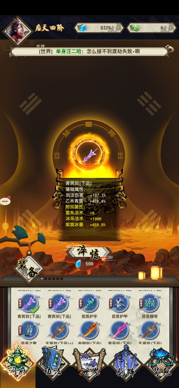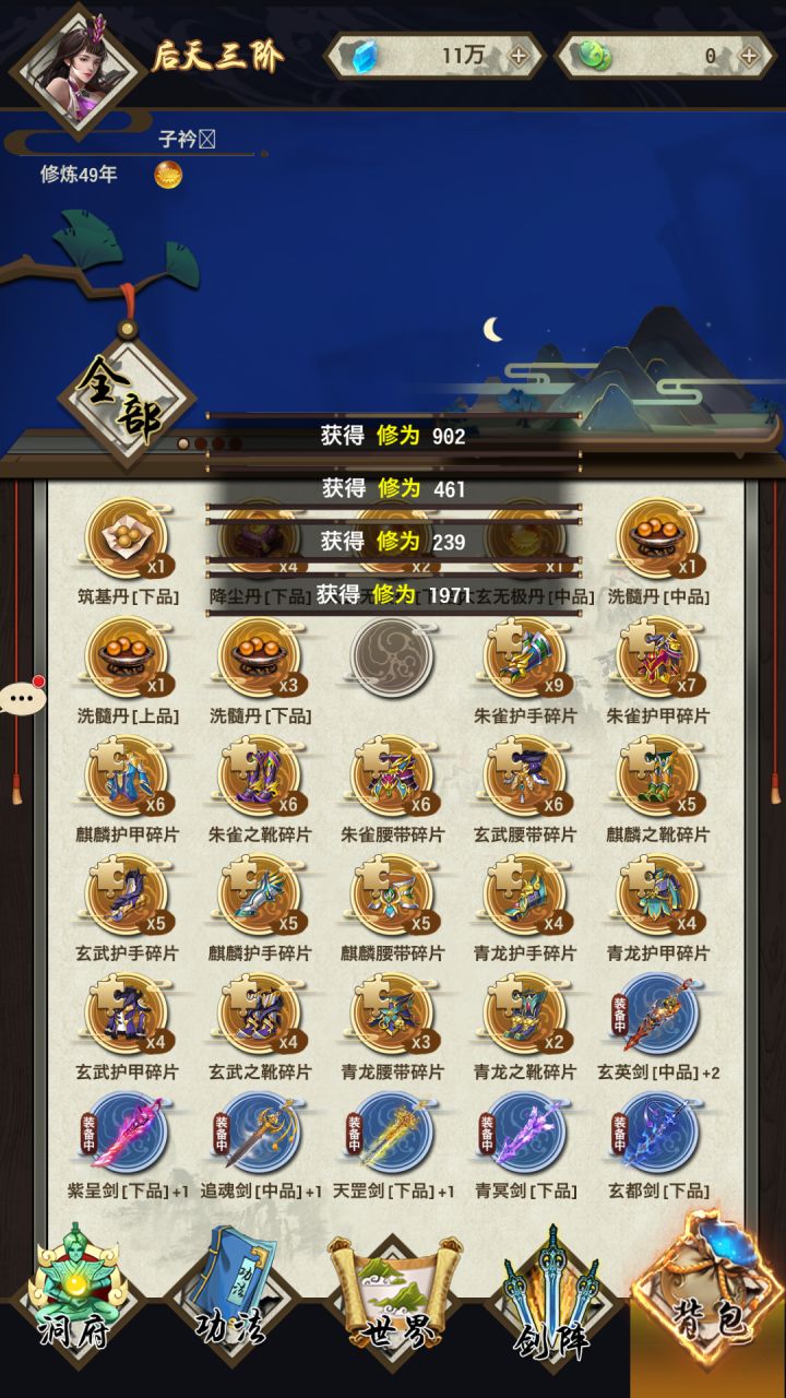 开局拿个接引,最好是放两个洗髓丹就可以了。然后升级,拿上背包的补偿直接开太玄加闭关,然后刷副本练筑基丹,有一个筑基丹就可以,怕渡劫失败的,练两个筑基丹突破筑基了,就练洗髓丹,基本上一年后天没问题。配图,这是我刚刚玩的,加入师门,师父给了两个巨灵丹,用不了,然后给我传功到了练气6。后面就是我自己玩的了,运气不错,开局第一章爆了两个中品剑
