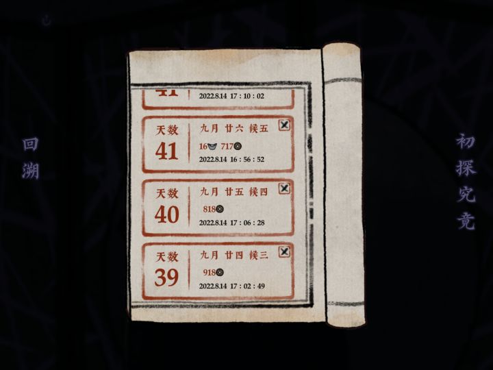通关啦!给伙伴们一些重要的不剧透小Tips:-害怕银钱不够用的话可以去当铺倒买倒卖赚钱,目前看来是酒最赚钱,但一般情况下钱不会用完,不必过于担心。-每天移动次数只有三次,第三次对应“晚上”,之后必须回客栈休息,记得把握次数和顺序。-多用宝镜观察场景,做宝镜笔录-人物互动的第二个选项可以用笔录来进行“对质”,很重要所以可以多试试-如果客栈有咕咕(鸽子)出现说明信盒中有来信,记得及时查看-