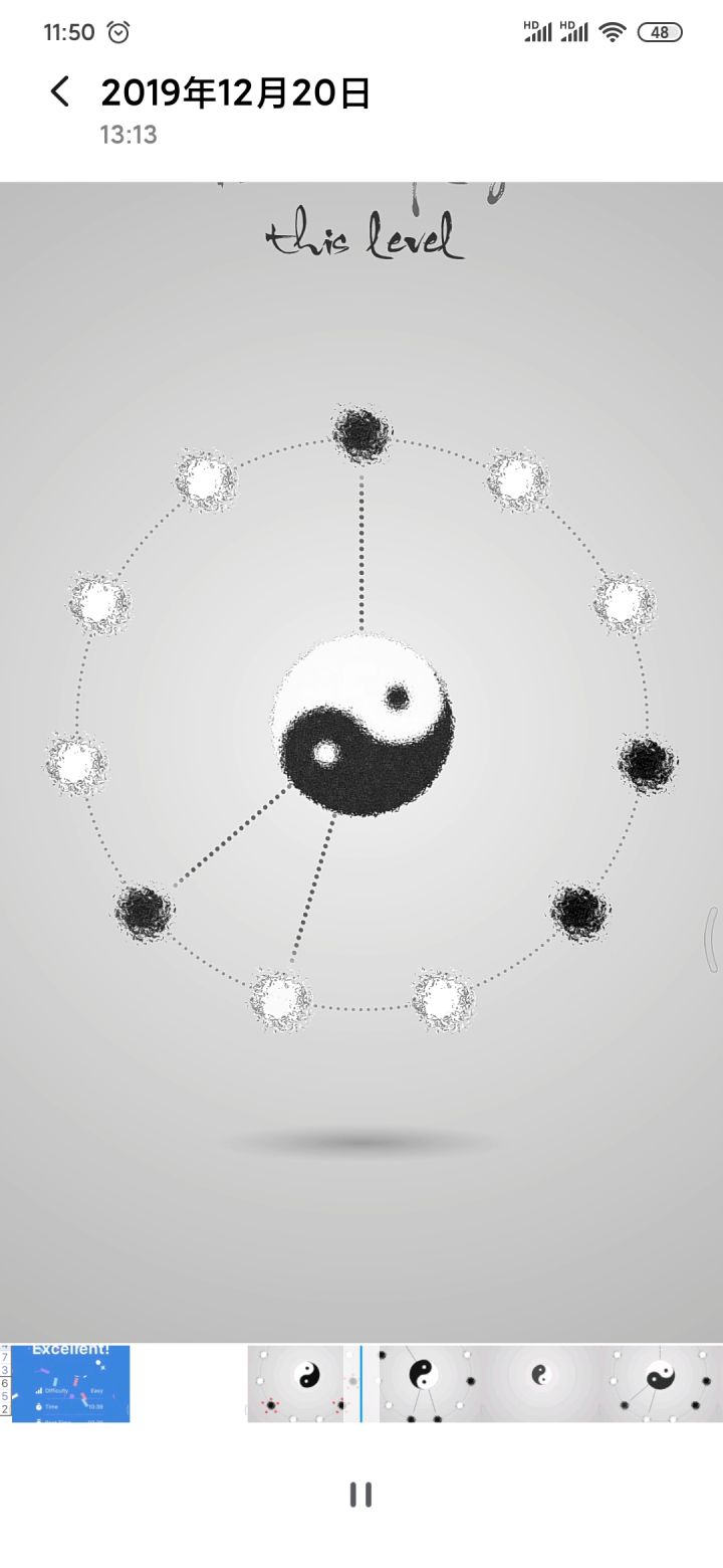 这是白色50关他有24个小球,每次改变9个。我们找24附近的9的倍数,分别是18和27,也就是差距6和3。然后第一步尽量吧白色和黑色分开我这一局比较简单分开后直接有余数3因为是9的倍数减去24余的3所以选中的时候要把3包括进去,反转3次就行了。这个图是把刚刚的反转做2次就可以了
