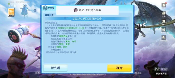 亲爱的探险家:为了保证服务器运行稳定并给大家带来更好的游戏体验,《堡垒前线:破坏与创造》所有服务器将于2020年01月09日9:30~11:30进行停服维护工作。如果在预定时间内无法完成维护内容,开机时间也将继续顺延。请各位探险家相互转告,并提前留意游戏时间,以免造成不必要的损失。维护期间给您带来的不便,敬请谅解,感谢大家的支持与配合。【维护内容】1、还在担心找不到魔盒补充护盾?全新道具精华