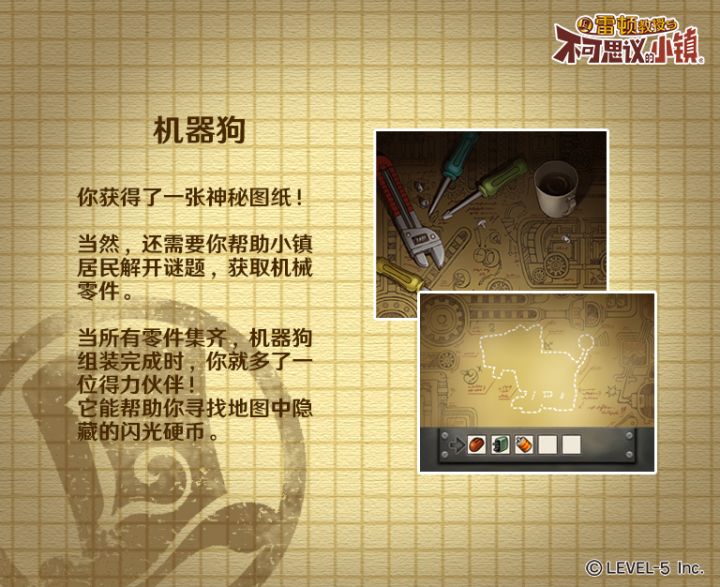 【功能介绍】机器狗你获得了一张神秘图纸!当然,还需要你帮助小镇居民解开谜题,获取机器狗零件。当所有零件集齐,机器狗组装完成时,你就多了一位得力伙伴!它能帮助你寻找地图中隐藏的闪光硬币,用于解锁谜题提示。打开方式:【旅行箱】-【机器狗】点击零件即可自动完成组装。