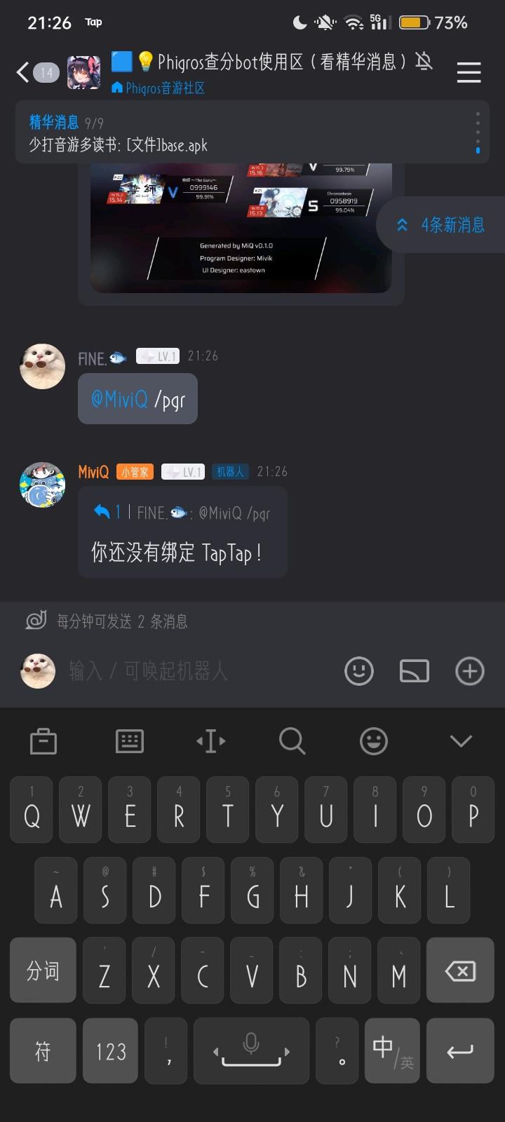 哪位大佬可以告诉我详细的教程啊,我目前已经加入了QQ频道,但是和机器人对话的时候它总是告诉我没有绑定tap,可是我游戏内已经绑定了呀,这个怎么办呢,有没有详细教程啊@_@#游戏讨论#phigros#新人求助