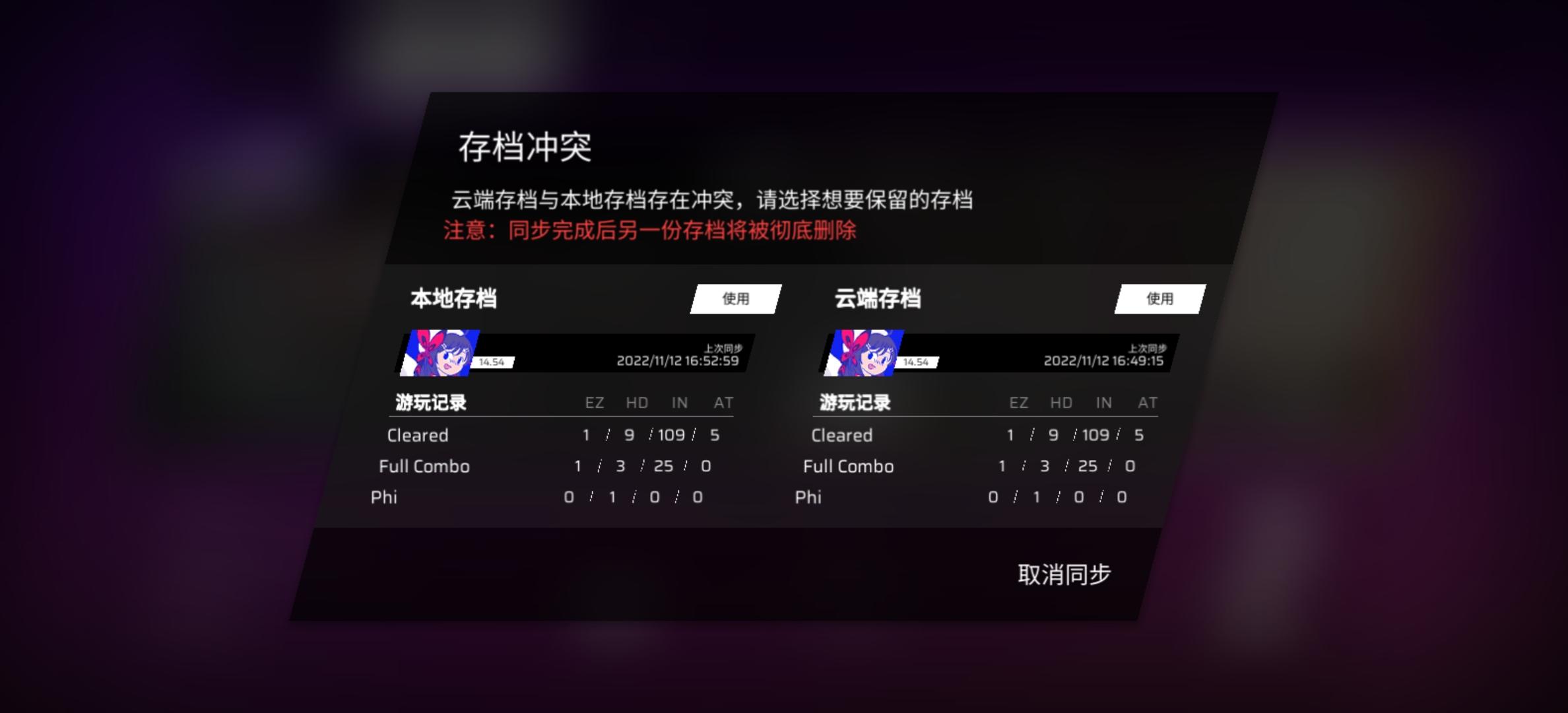 急!求解答问题一:我已开启自动同步(即每打完一首歌就同步一次),直至11月12号,突然自动同步失败,如图1、图2问题二:手机(本地)存档把云端存档覆盖,该按哪个按钮?(即11月16号的存档将11月12号覆盖),如图3