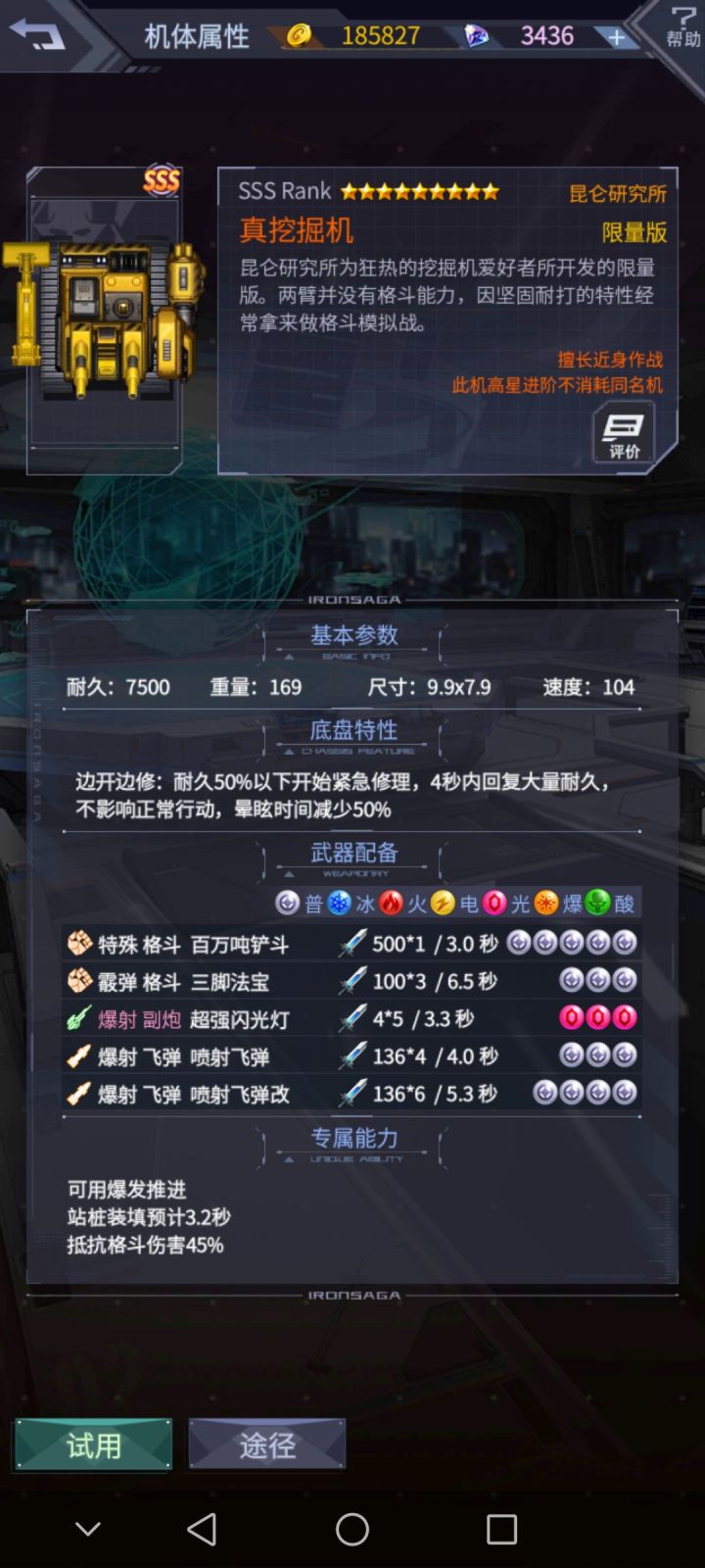 真挖掘机的模型坏了左手变成铲斗(且悬空,与身体无连接),仅在放飞弹时变回正常左手。履带不断闪烁