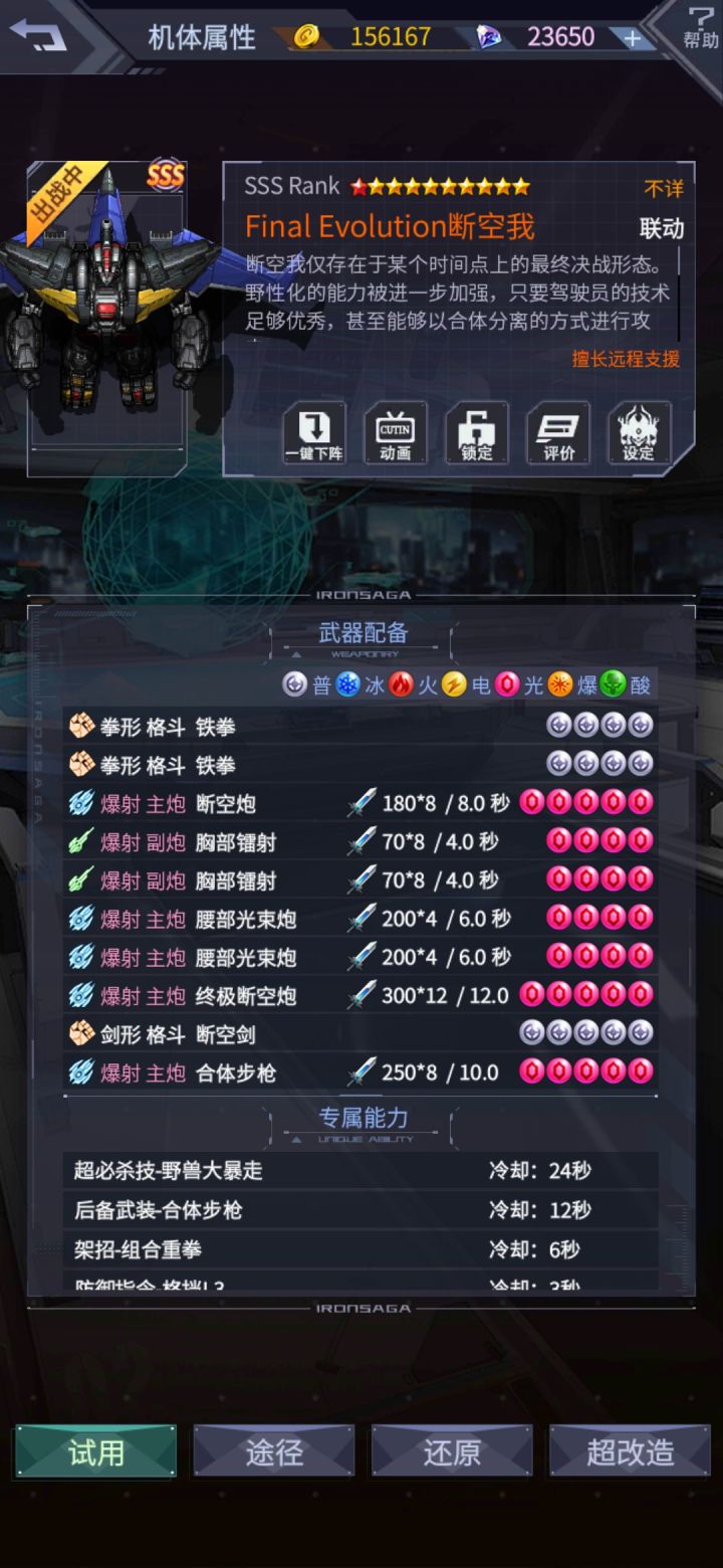 在这里不得不说一下,ph为了推马爹无所不用其极啊!看看对比阿断大管主炮攻击竟然还不如马爹的细小短管主炮。策划请想想吧一个超级系的竟然还不如现实系机体。出于对萝卜机战的喜爱我对这游戏也支持了不少。当时是对剧情吸引一下然后入坑还期待会越做越好结果整了一些有的没的到最后干脆都不整了。之前调查问卷联动要Eva没Eva要革命机也没。革命机没就算了Eva我不相信调查结果会没上榜。话不多说上图为证。最后光子多美啊出些新皮肤不好吗?整个半机械娘算了还整的超难看。看那活动界面的头像一脸GC样挺恶的。要就恶一点把舌头都吐出来好了。亏了我还昏了头买了168高级活跃的冰盾机体。请原谅我现在连机体名都记不住了。