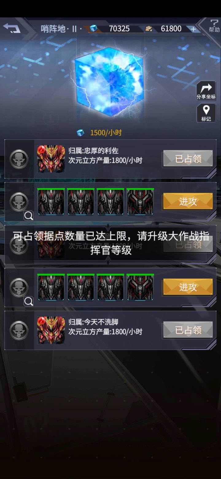 这个次元大作战我觉得应该加一个打一半会在地图上显示的功能,我昨晚一个二级据点就打了一波,然后没能量就没打第二波,结果今天怎么找都找不到了,还显示我占领达到上限,但是我明明就占领了四个而已啊,这波是无能狂怒了,拿不到指挥官奖励了😭😭😭(今天才发现有标记这个东西,这波亏大发了)——————————————————————————这波我是懵逼了是BUG无疑了,各位看后面两张图,是我重启游戏然后截的,已经显示我占领五个了,但是任务还是没有完成,只能说这个模式BUG太多了,希望官方快点修复😞😞