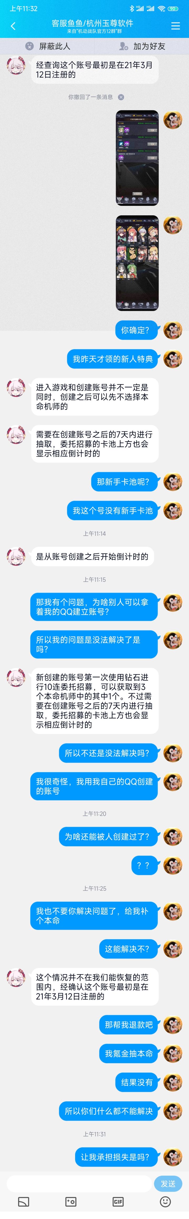 我服了,玩家维权怎么这么难,按照这个客服的意思是,我去年建了个号没有认证实名信息,没有选择本命,也没有进过游戏。更绝的是,我用QQ建的号,QQ客服说去年的3月12号我没有申请过QQ账号权限。所以到底是谁在一年前用我的QQ建了个号?