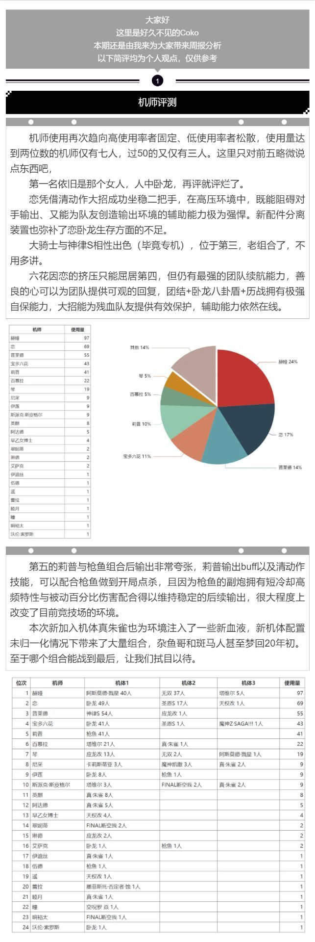 雷泽额可以选择雷泽顿开,也可以选择迪妮莎等一众远程机师,因为雷泽顿机师自身身板过于脆弱,如果被压场,效果会很差,所以也可以考虑别的远程机师开雷泽顿。魔改山猫中规中矩,持续输出很不错,如果没有别的选择,也可以上他,配件方面,可以靠近竞技场配装。