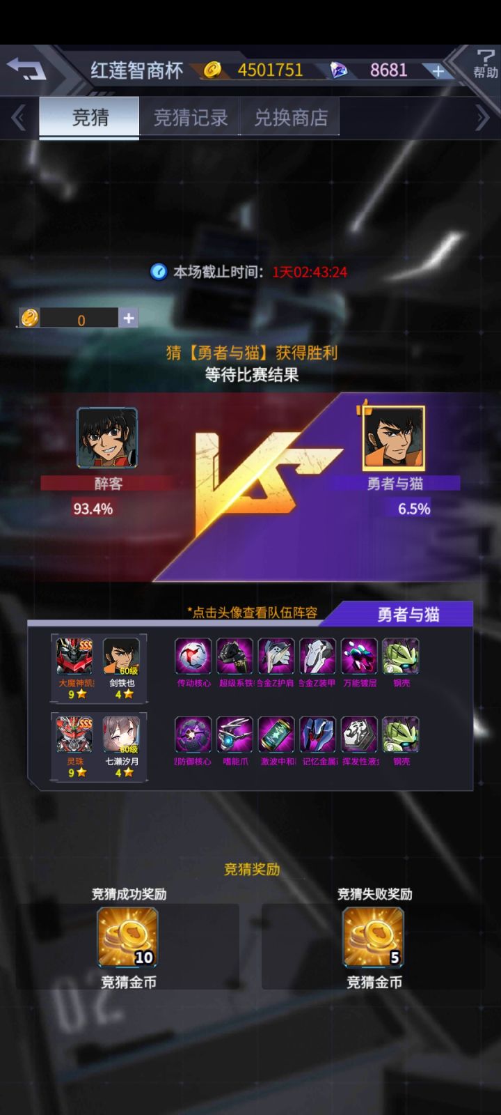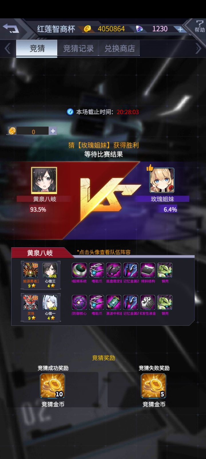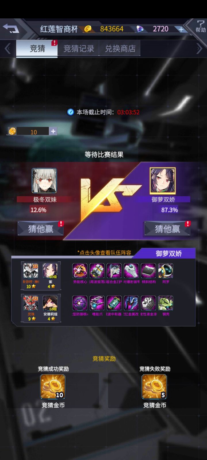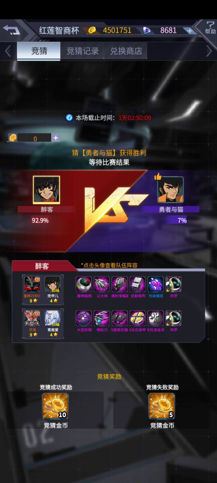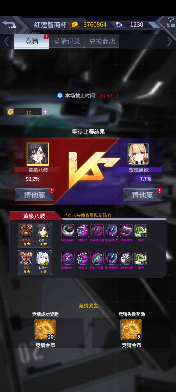 大家好,我是大家的老朋友阿晴,今天带来了新的竞猜预测,老规矩,图一二三可以证明是我本人的号,金币钻石对的上,我不会自己压右,骗大家压左的,有福同享,有难同当。首先是双方机师,灵珠的装备一样,变量就只剩机师了,左侧的机师是百慕拉,右侧的机师是男能可柜的人间体,男能可柜虽然强,但是他的人间体很菜,所以双方灵珠的机师来说,左边胜算大。其次是空呪罗和煌雷我,如果有细心的小伙伴仔细看名字,就会发现,这场
