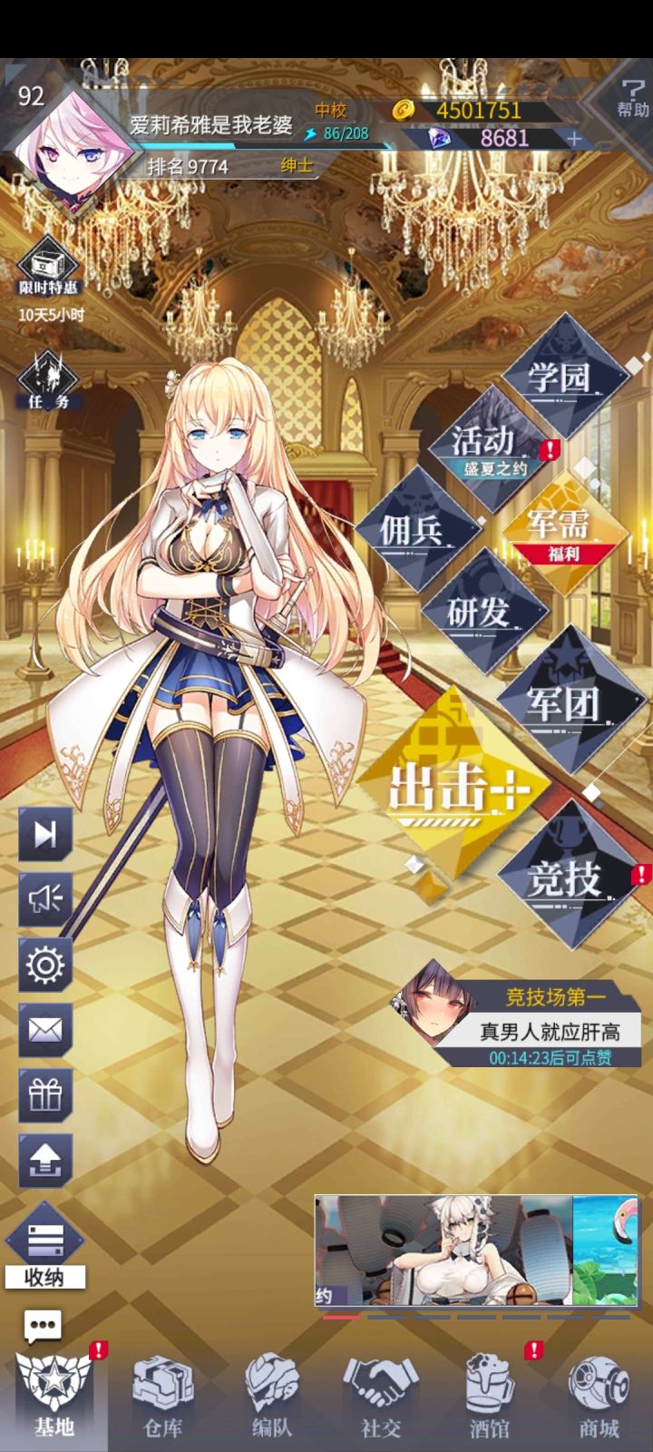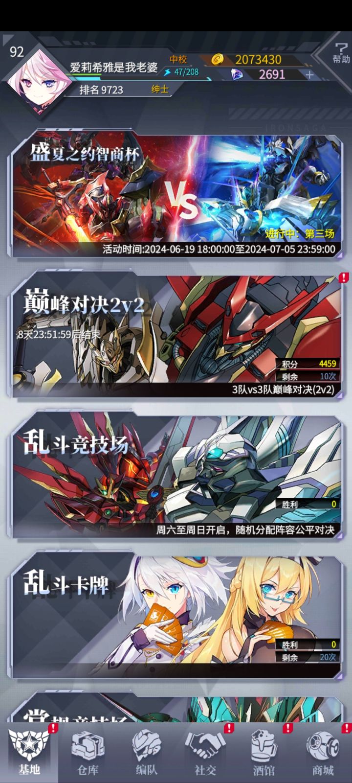 号:不推荐自建…抽卡:看左上角写着高端市场1可以无脑抽,代表最新机体,至少这个月内不会弱重要省钱小常识:没有“0命战神”的说法,绝大多数机体3台既7星启用,大多是顺序开底盘动作,9星与7星差距不大重要打活动小知识:没有好友助战可以加入军团嫖团友阵容日常推荐顺序(个人向):懒狗做到第1可以下号了…1.每日签到2.觉醒币+每日活动扫荡竞猜擂台3.挑战+觉醒机师礼物(建议优先刷深
