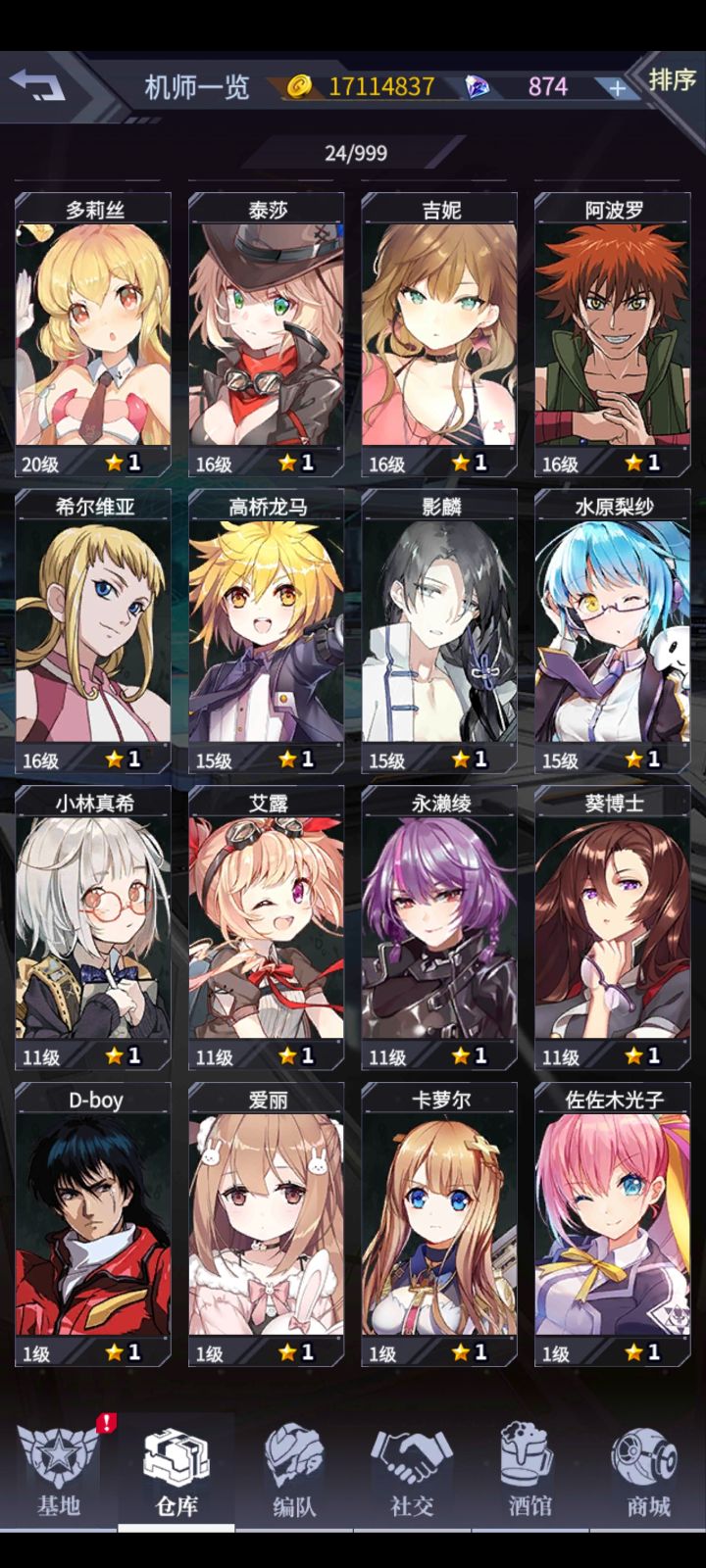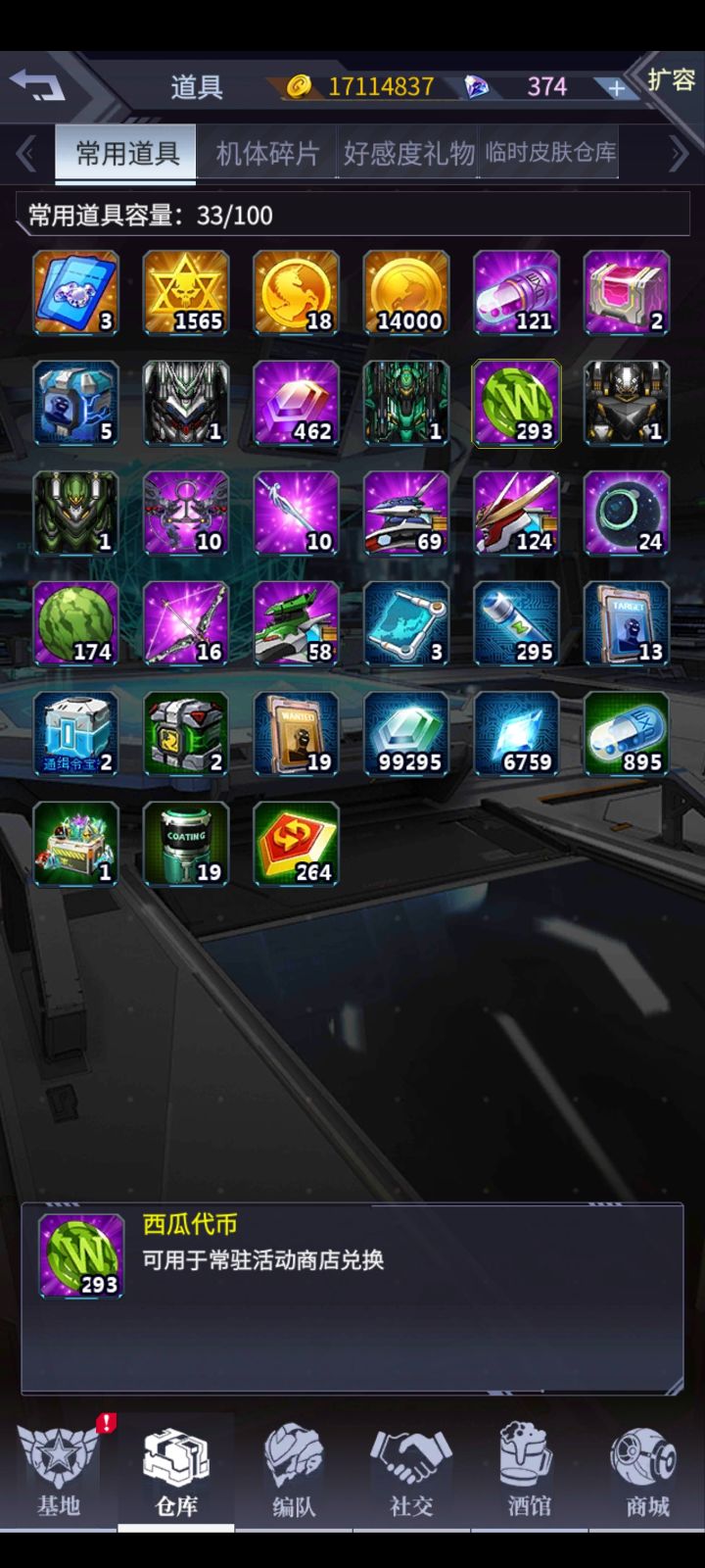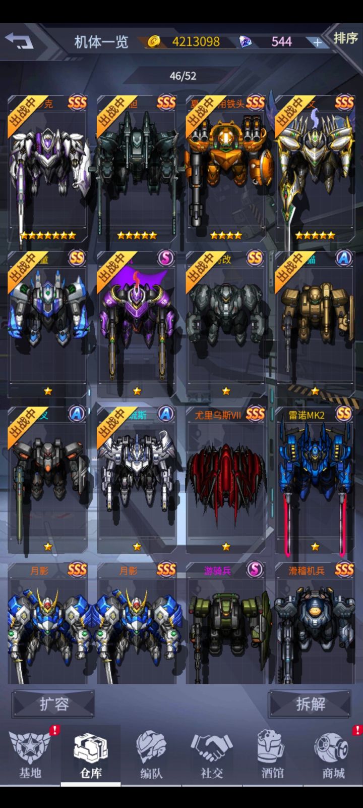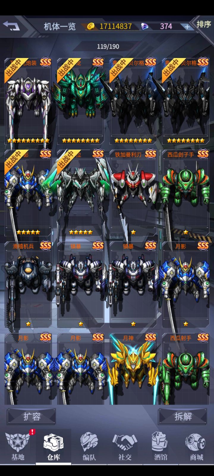 刚玩几天,新手一大堆问题想问搞的自抽号,目前就这些机师,那个值得练啊,那个泥头机上了九星真的比八星差么,感觉仓库不够用,钻石全部被我拿来扩容了,不知道对不对,还有就是我仓库里的西瓜怎么找不到兑换商店