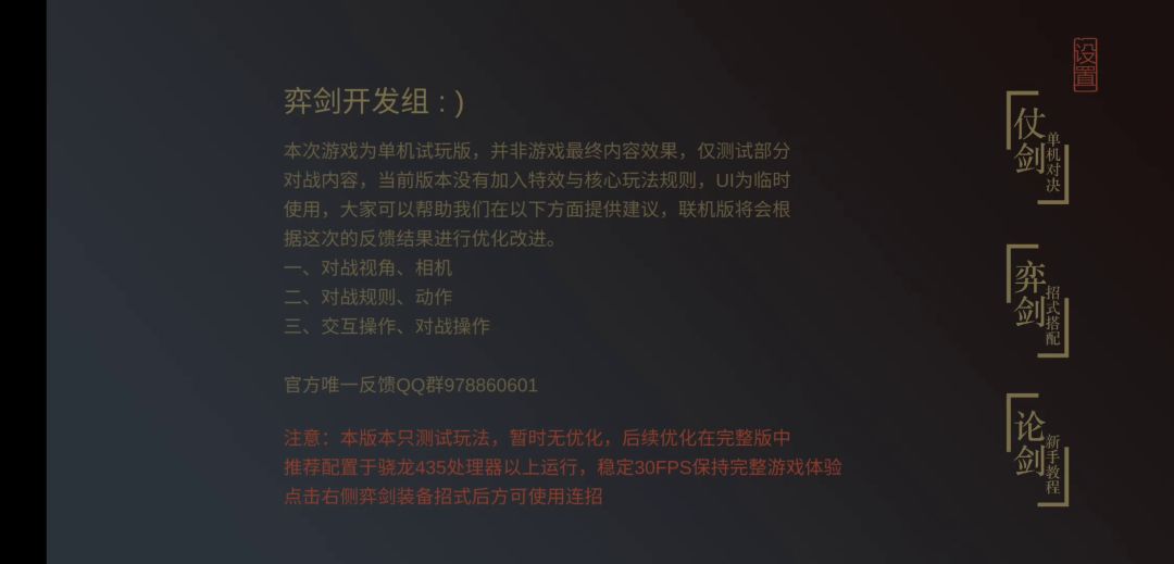 新人别嫌太难,这游戏现在连特效都去没做出来,只是试用版的,所以有些人会说滑动手感不好太难,其实在群里的各位过了宗师的都觉得滑动自由度比按键高。有人觉得基础剑法太僵硬了,没啥卵用,并且技能衔接很不流畅,群里的大佬解释了,基础剑法才是最强的剑法,因为太强,在没有气的限制下,会直接被连死毫无反抗之力。试用版没有内气的限制,所以技能必须有限制,但只要掌握节奏感还是可以流畅的衔接技能的。最后说一次,宗
