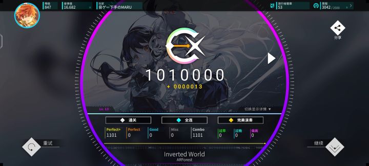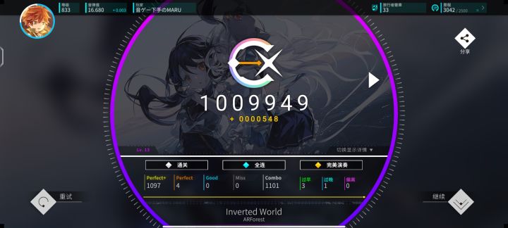 方向盘第一章魔王曲Inverted World怒推43个小???直接Max-4了Rating喜加0.003