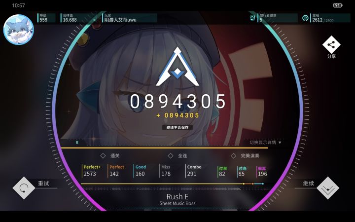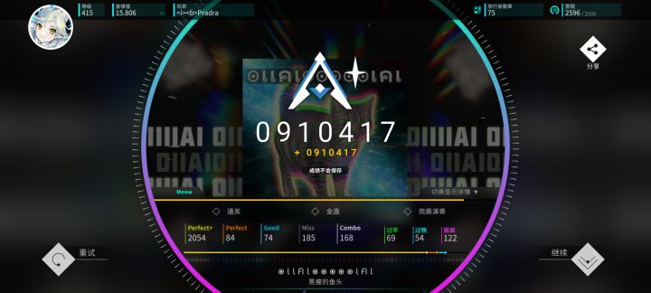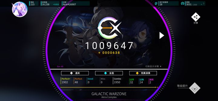 半夜心血来潮打了一把,没想到打上头全连了,感谢Excel(εxceζ),最喜欢的Aoi的曲子,高潮段突然的升调打起来好带感,推荐没买的玩家可以等活动时入手尝试打一下;娱乐玩家不会音押,理论值不指望了,随缘吧#游戏日常碎片#rotaeno