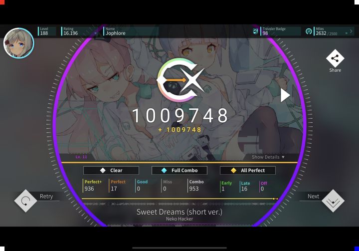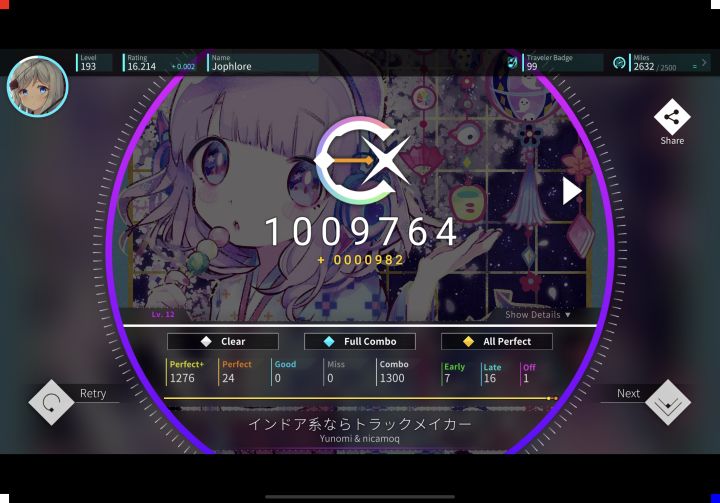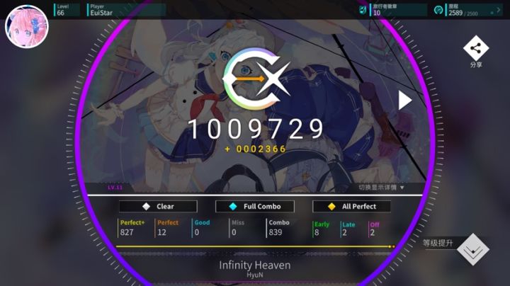 这次更新质量好高,就是没有12+和13有点小失落,8和11都是初见AP,My Story!初见2g二见1g1miss三见收,Cross†Genocide初见1g二见2g三见收,就室内系打得稍微久点,中午11点更新打了半小时,手癖了,吃完晚饭再打,第一把在长交互爆g,第二把就收了。其实室内系总体难度不高,就是长,曲子长了就很容易失误。难度IV再次制霸!什么时候能再来首13呢,13+也不是不行(我在想peach