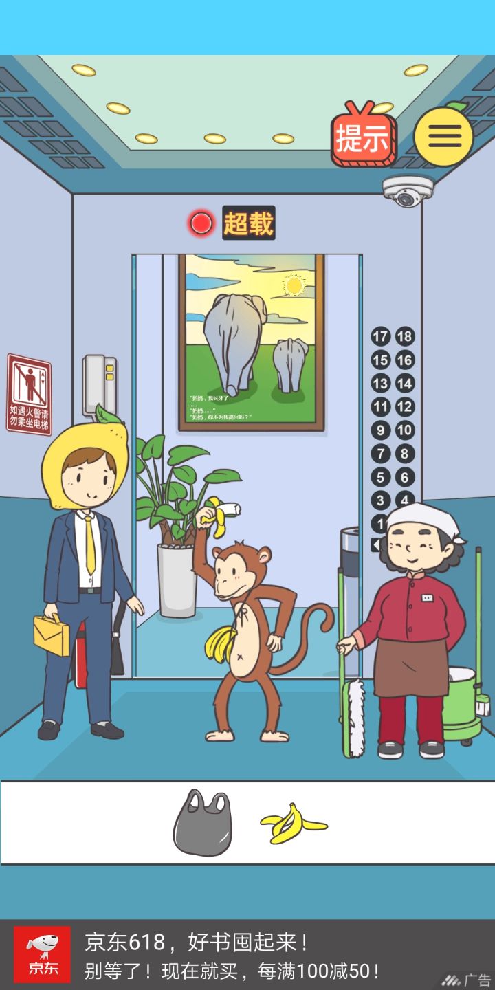 第一关:阿姨那有个垃圾袋,地上有个香蕉皮,合起来扔进垃圾桶第二关:点电梯的每个人,除了胖子,胖子会停下,然后再点电梯关门第三关:点左边的扫把,摄像头上有蜘蛛,用扫把把蜘蛛扫下第四关;点右边的油漆桶,垃圾桶的老鼠,将老鼠拉到肌肉男身上,再用油漆桶涂锤子上第五关:点左边的男孩帽子上的仓鼠,再点自己包会有松子,把松子给仓鼠第六关:点外面叶子的虫子,把虫子放到收音机里第七关:右边贵妇lv包里有