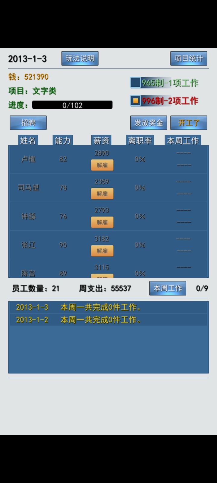 希望可以详细分配工作这样的话玩法会更细致以及弱弱的说一声要不考虑一下添加:女性产假 员工年假家庭变故的事假或者长期九九六后员工猝死 家庭破碎 保险赔付法律事务 公关危机这样会更好玩啊!当然我知道这样的话或许会与游戏初衷相违背但现实总是困难模式嘛也许可以尝试短年限的创业公司模式和长年限的细致管理模式