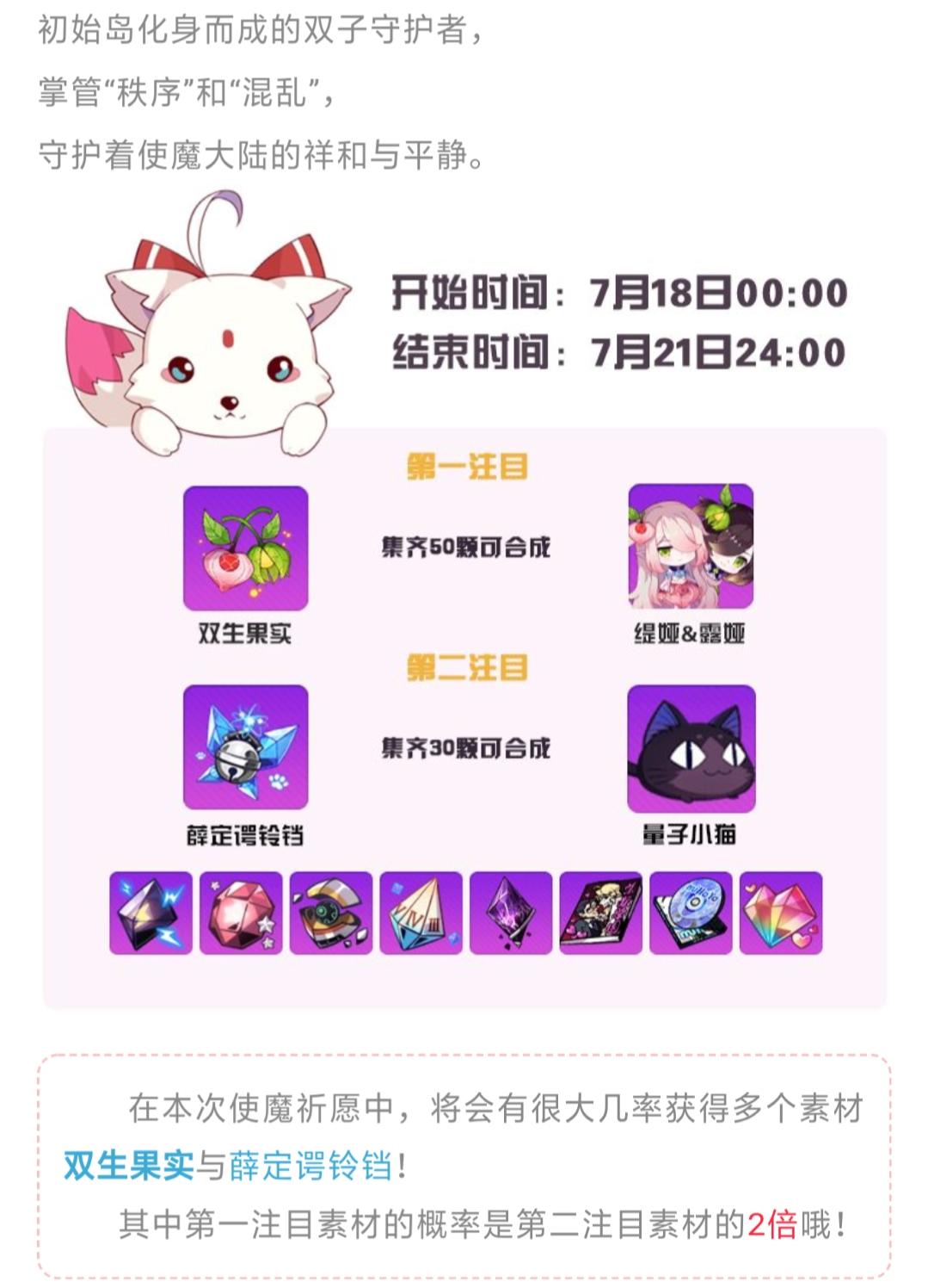 初始岛化身而成的双子守护者,掌管“秩序”和“混乱”,守护着使魔大陆的祥和与平静。在本次使魔祈愿中,将会有很大几率获得多个素材双生果实与薛定谔铃铛!其中第一注目素材的概率是第二注目素材的2倍哦!咳咳,本小姐有个重大的情报要告诉乃们~!(✪ω✪)7月20日即将开放的八重樱生日小剧场里会特别放送一片【双生果实】哦~乃们可以计算一下自己手中的使魔碎片数量啦~!说起来……下午的时候灵依娘还说了