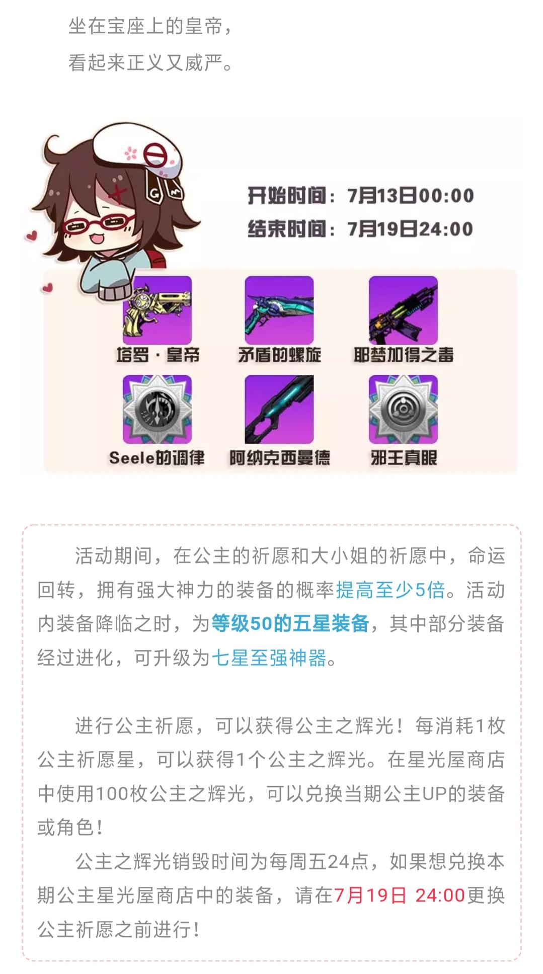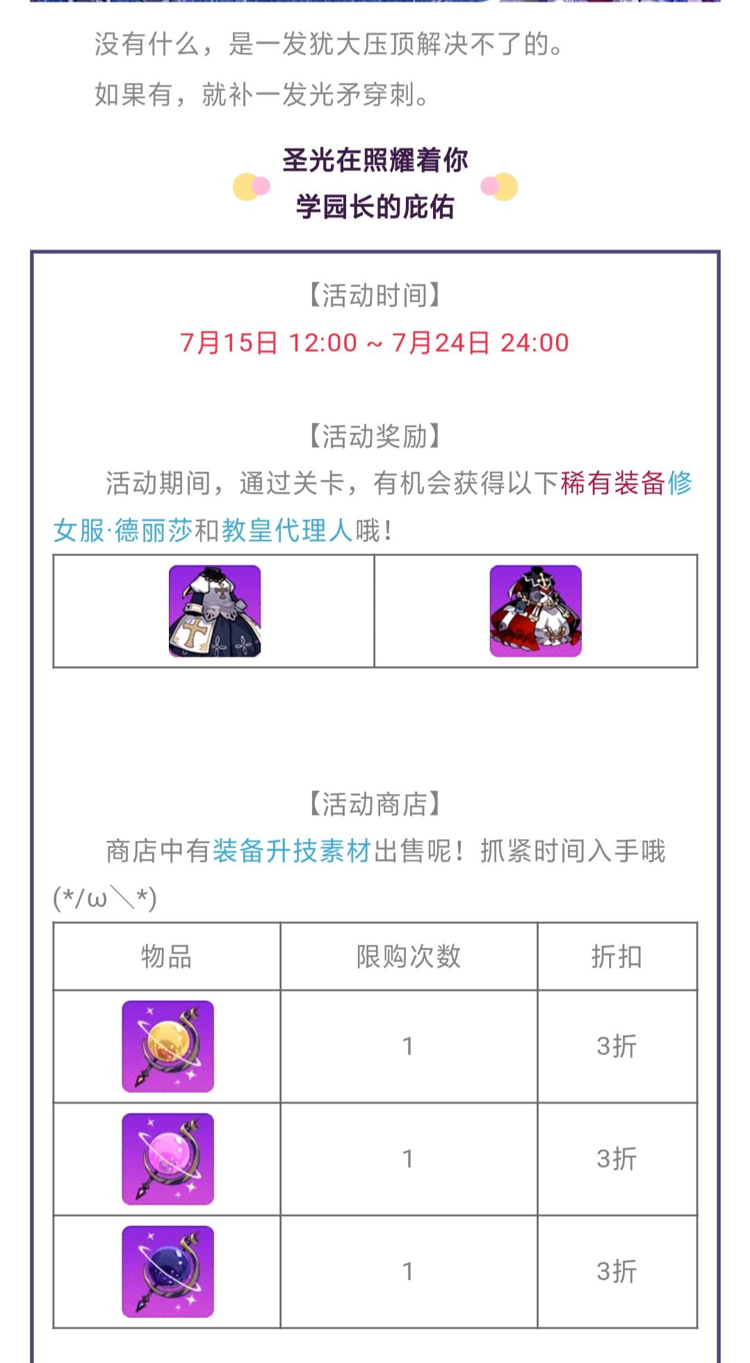 新的一周来啦!都来跟本小姐一起迎接新探险吧~(ノ゚∀゚)ノ喂喂!干嘛一脸嫌弃!坏人(TロT)σ本来还想给你们读下本小姐整理的课表呢,哼!嗯?夸本小姐一下,本小姐就读给乃们听~~~φ(≧ω≦*)♪ 通通都给本小姐认真打活动知道嘛,别掉队啊!肝力十足扶我起来!我还能肝!少女们的命运就此交织!——DATE·A·HOUKAI活动时间:7月5日00:00 ~ 7月18日24:00《崩坏学