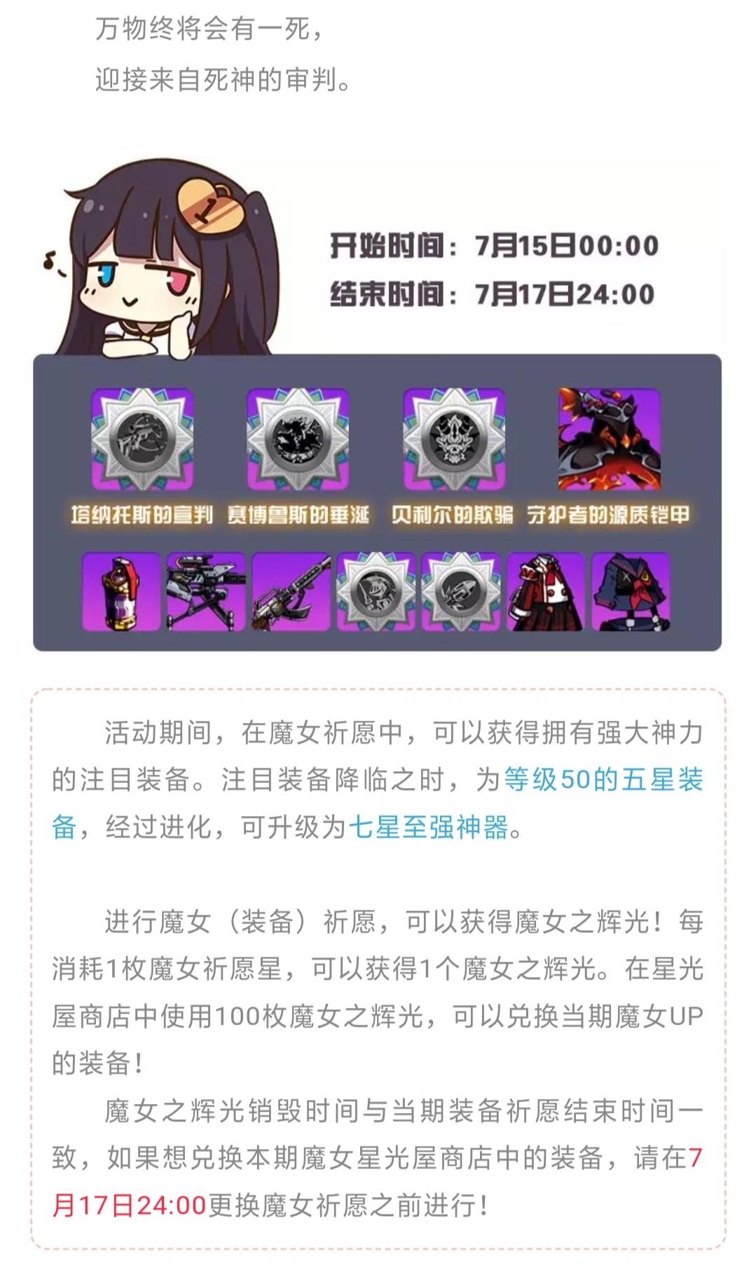 万物终将会有一死,迎接来自死神的审判。活动期间,在魔女祈愿中,可以获得拥有强大神力的注目装备。注目装备降临之时,为等级50的五星装备,经过进化,可升级为七星至强神器。进行魔女(装备)祈愿,可以获得魔女之辉光!每消耗1枚魔女祈愿星,可以获得1个魔女之辉光。在星光屋商店中使用100枚魔女之辉光,可以兑换当期魔女UP的装备!魔女之辉光销毁时间与当期装备祈愿结束时间一致,如果想兑换本期魔女星光屋商