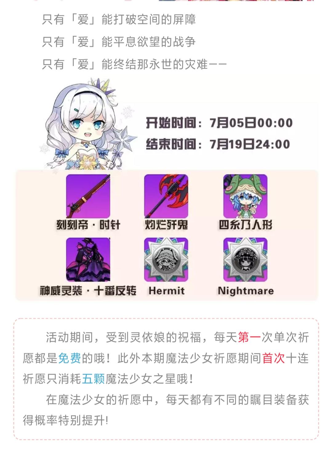 只有「爱」能打破空间的屏障只有「爱」能平息欲望的战争只有「爱」能终结那永世的灾难——活动期间,受到灵依娘的祝福,每天第一次单次祈愿都是免费的哦!此外本期魔法少女祈愿期间首次十连祈愿只消耗五颗魔法少女之星哦!在魔法少女的祈愿中,每天都有不同的瞩目装备获得概率特别提升!活动期间,在魔法少女的祈愿中,拥有强大神力的装备的概率提高至少5倍。活动内装备降临之时,为等级50的五星装备,其中部分装备经