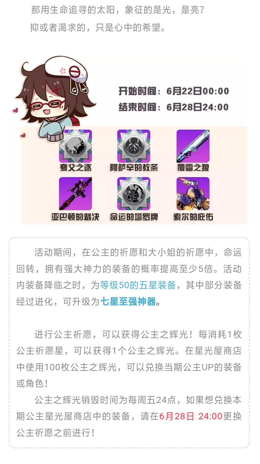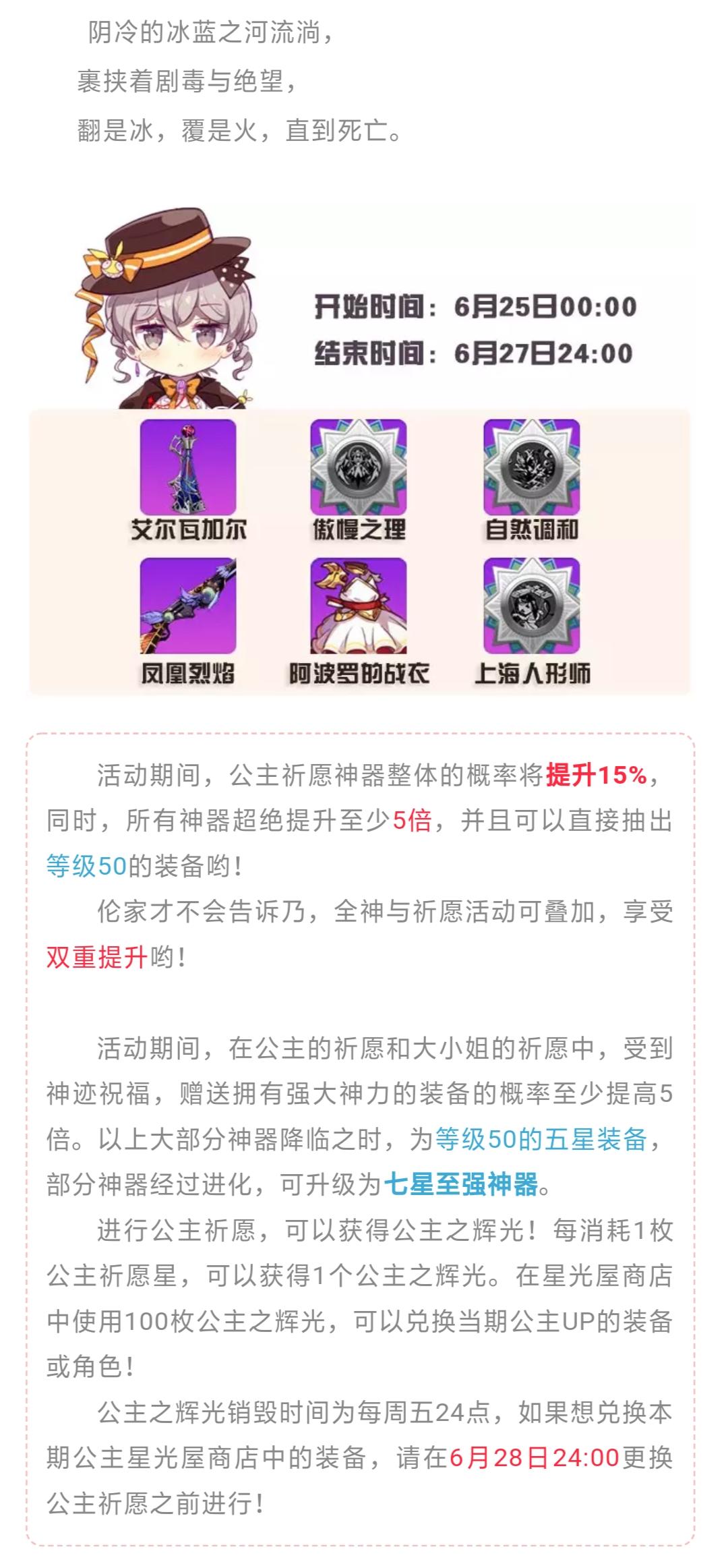 阴冷的冰蓝之河流淌,裹挟着剧毒与绝望,翻是冰,覆是火,直到死亡。活动期间,公主祈愿神器整体的概率将提升15%,同时,所有神器超绝提升至少5倍,并且可以直接抽出等级50的装备哟!伦家才不会告诉乃,全神与祈愿活动可叠加,享受双重提升哟!活动期间,在公主的祈愿和大小姐的祈愿中,受到神迹祝福,赠送拥有强大神力的装备的概率至少提高5倍。以上大部分神器降临之时,为等级50的五星装备,部分神器经过进化