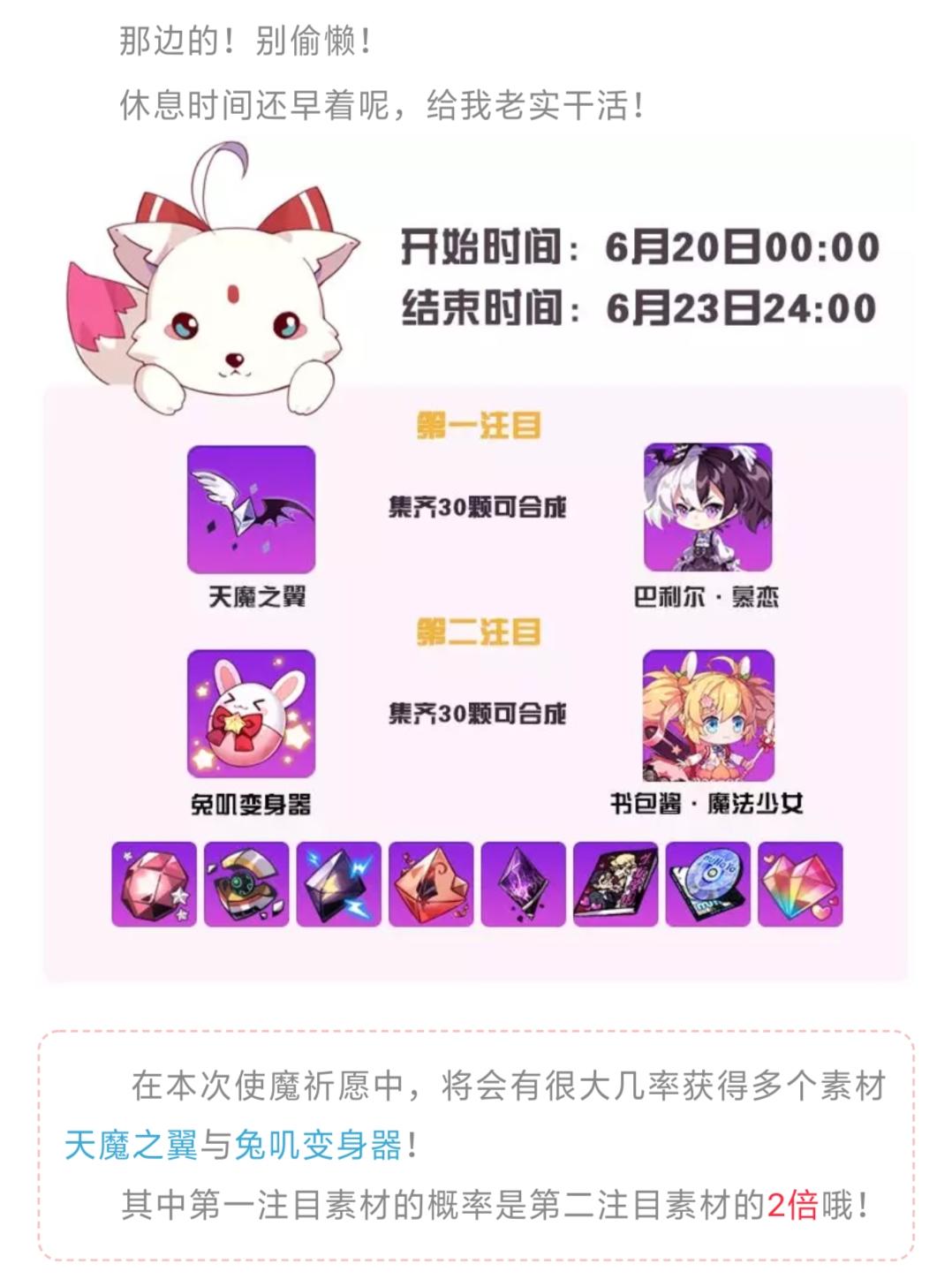 ( ̄▽ ̄)/这里前来为大家做情报速递的崩坏娘~目前阵营已经正式开始啦!大家都要努力加油的说٩( 'ω' )و对啦对啦,千万不要忘记资源争夺战哟!ヽ(○´∀)乂(*´∀`*)跟随着乃选择支援的首领,努力作战吧!!!ヾ(o′▽`o)ノ°°(・ω<)呐~接下来是本周的课表,答应本小姐一定要积极参与哟!肝力十足 扶我起来!我还能肝!活动时间:6月21日 12:00 ~ 7月21日23:59风