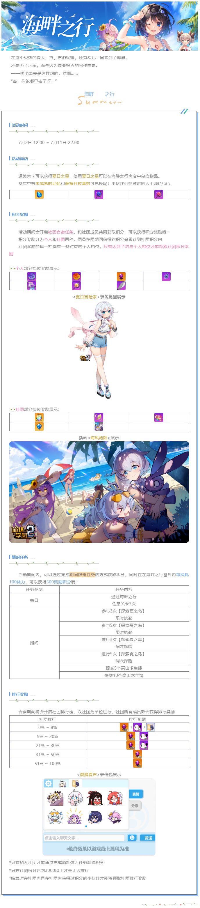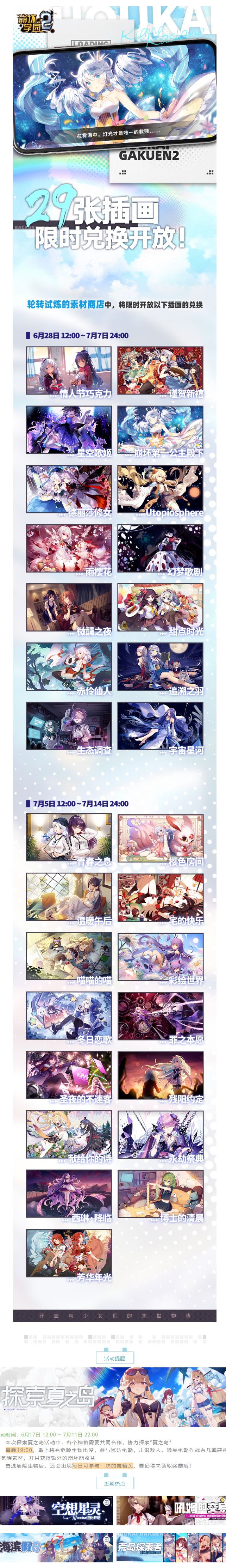 6月28日 12:00 ~ 7月7日 24:00和7月5日 12:00 ~ 7月14日 24:00,轮转试炼的素材商店中,会限时开放插画的兑换~本次总计会有29张插画上架供大家挑选~其中有12张是全新的插画哟!每张插画的兑换需要2000崩坏结晶!快来看看吧~